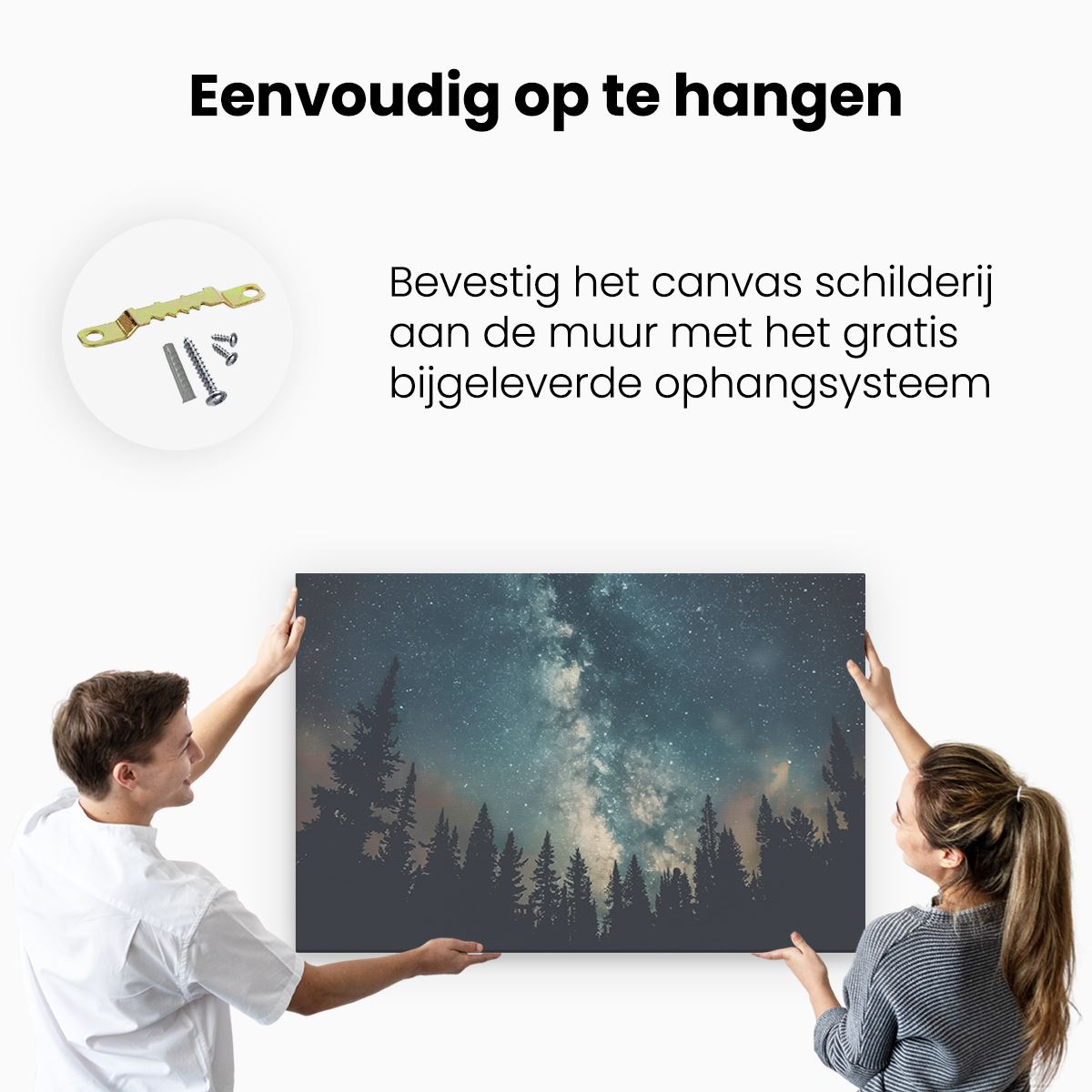 Bij aankoop ontvang je een meegeleverd ophangsysteem, zodat je op een simpele en snelle wijze het schilderij boven de bank of bed kan monteren.