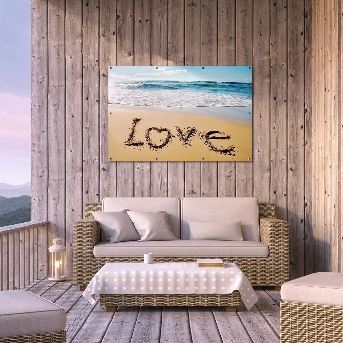 Tuinposter Het Woord Liefde is Geschreven in het Zand op een Strand