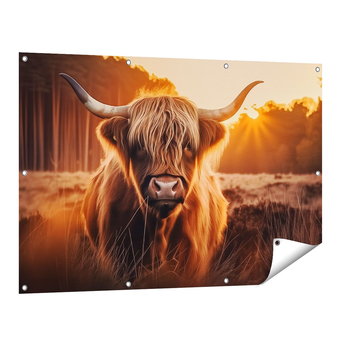 Tuinposter Hooglandkoe die in een Veld Staat bij Zonsondergang