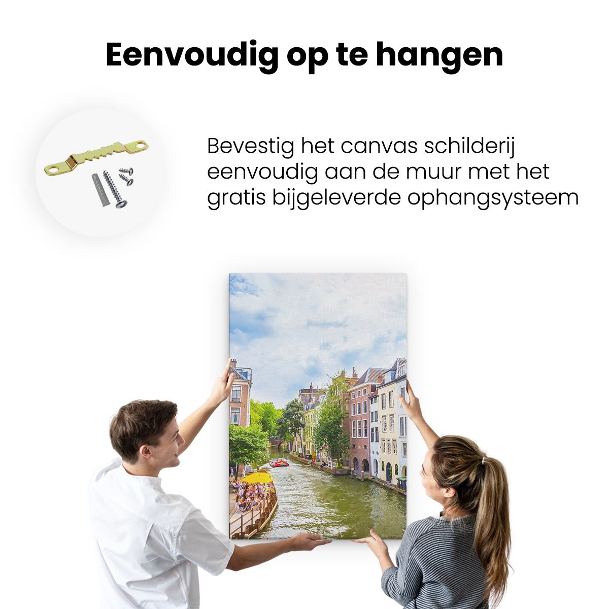 Bij aankoop ontvang je een meegeleverd ophangsysteem, zodat je op een simpele en snelle wijze het schilderij boven de bank of bed kan monteren.
