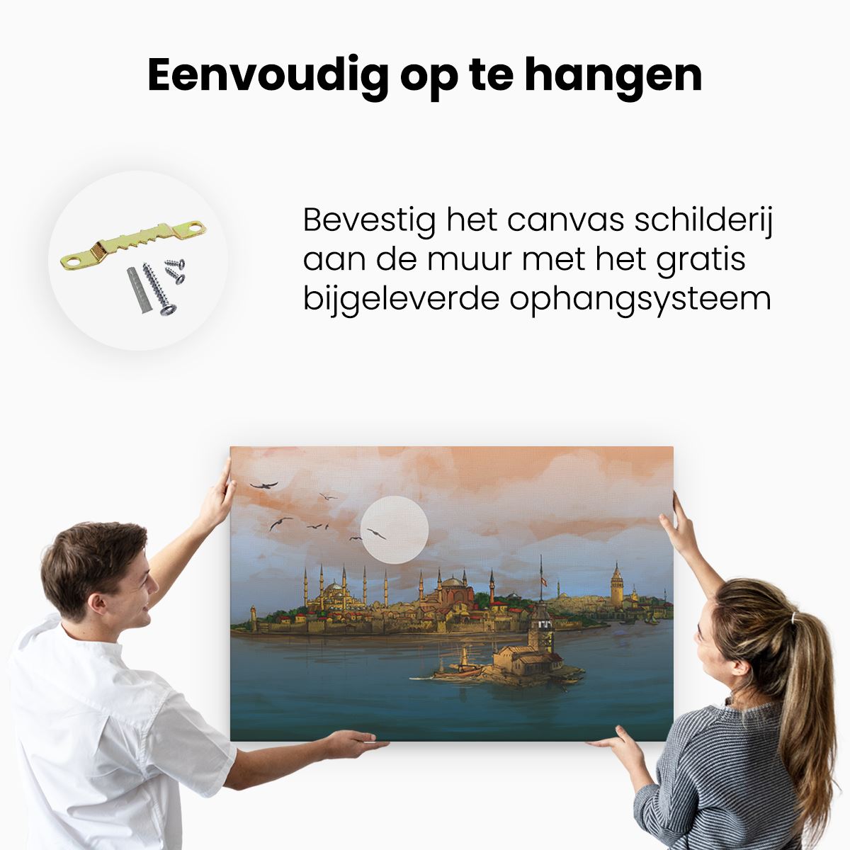 Bij aankoop ontvang je een meegeleverd ophangsysteem, zodat je op een simpele en snelle wijze het schilderij boven de bank of bed kan monteren.