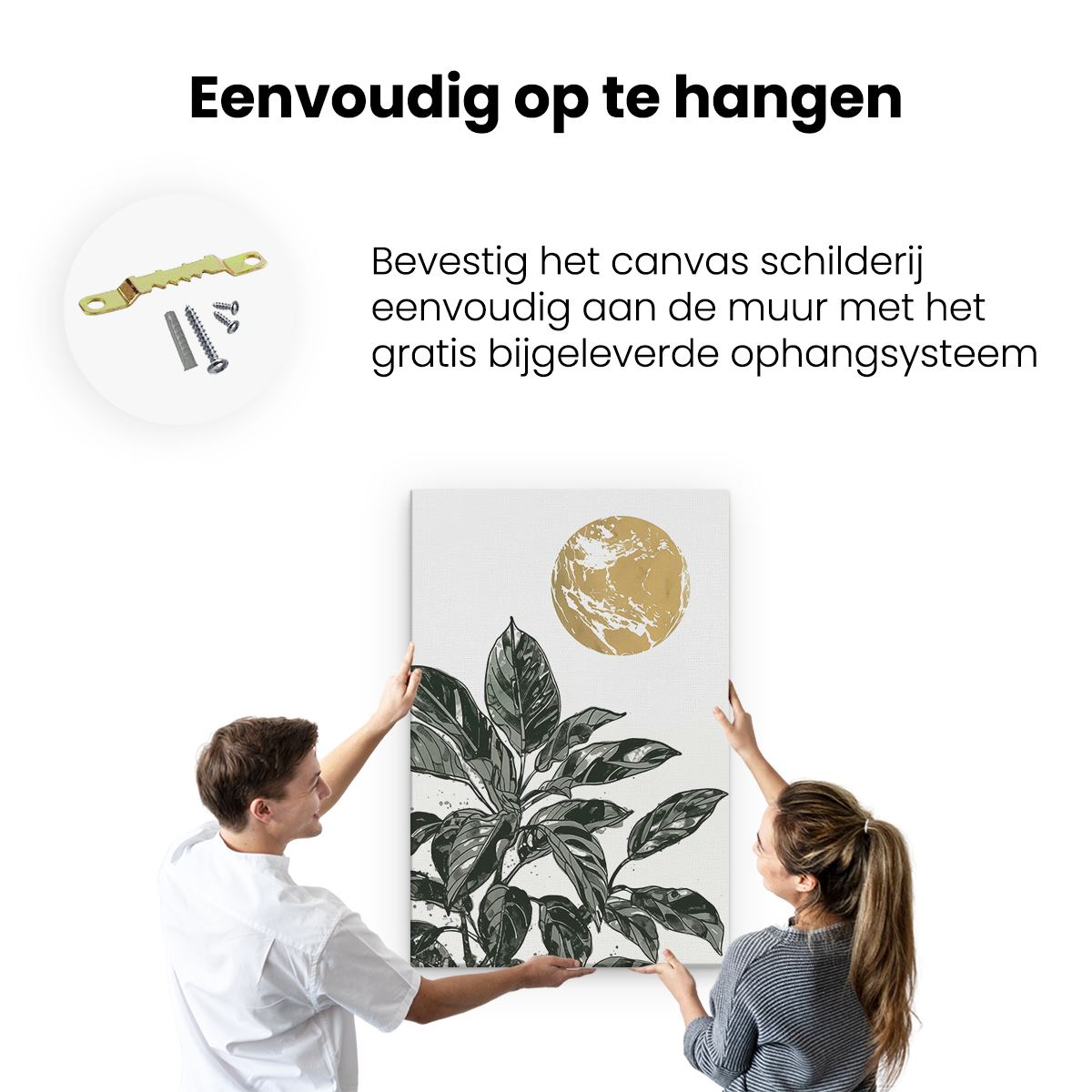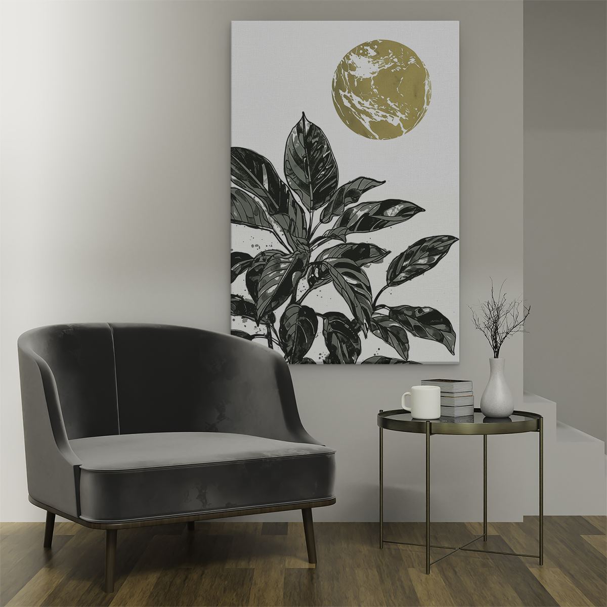 Schilderij Illustratie van een Plant met een Gouden Maan op de Achtergrond