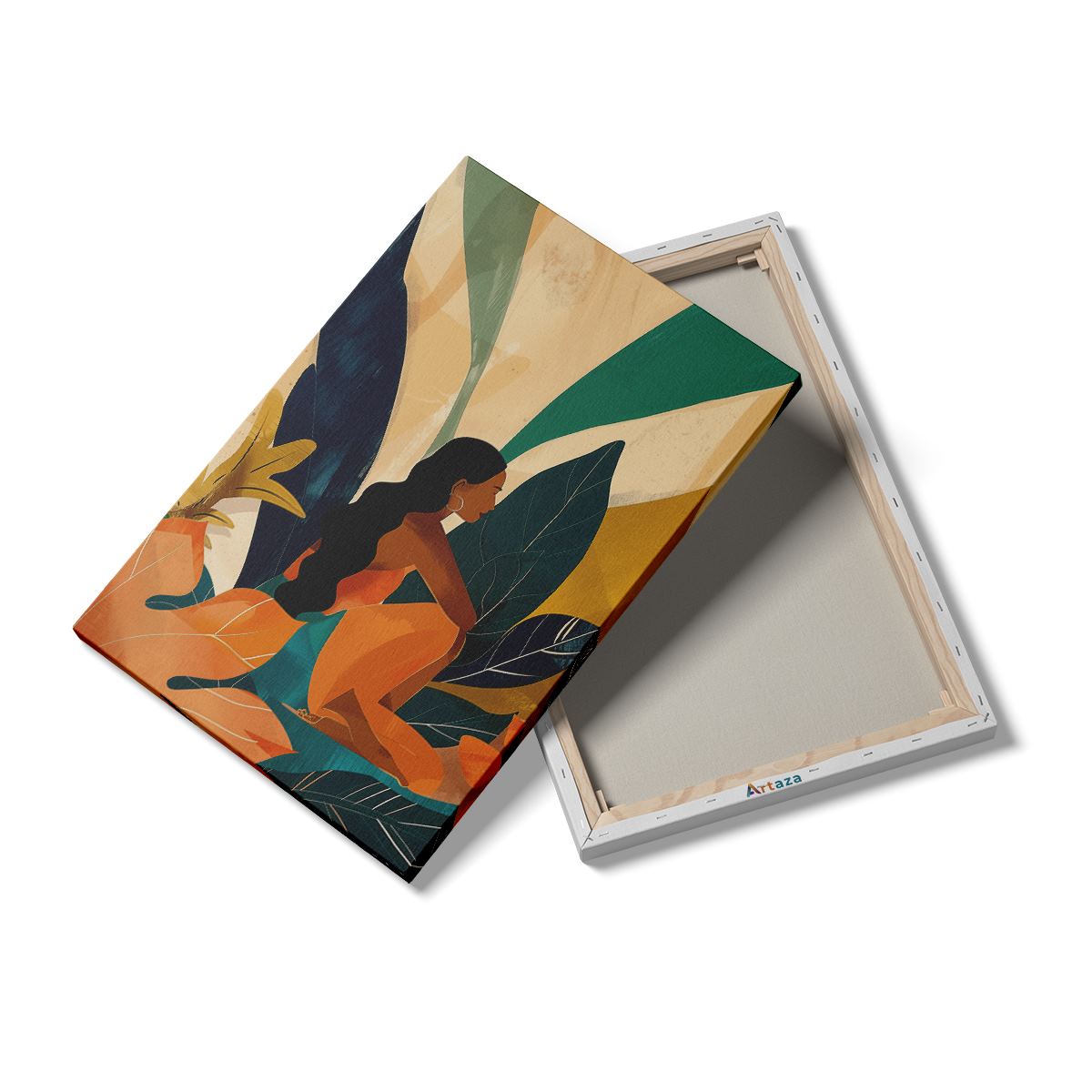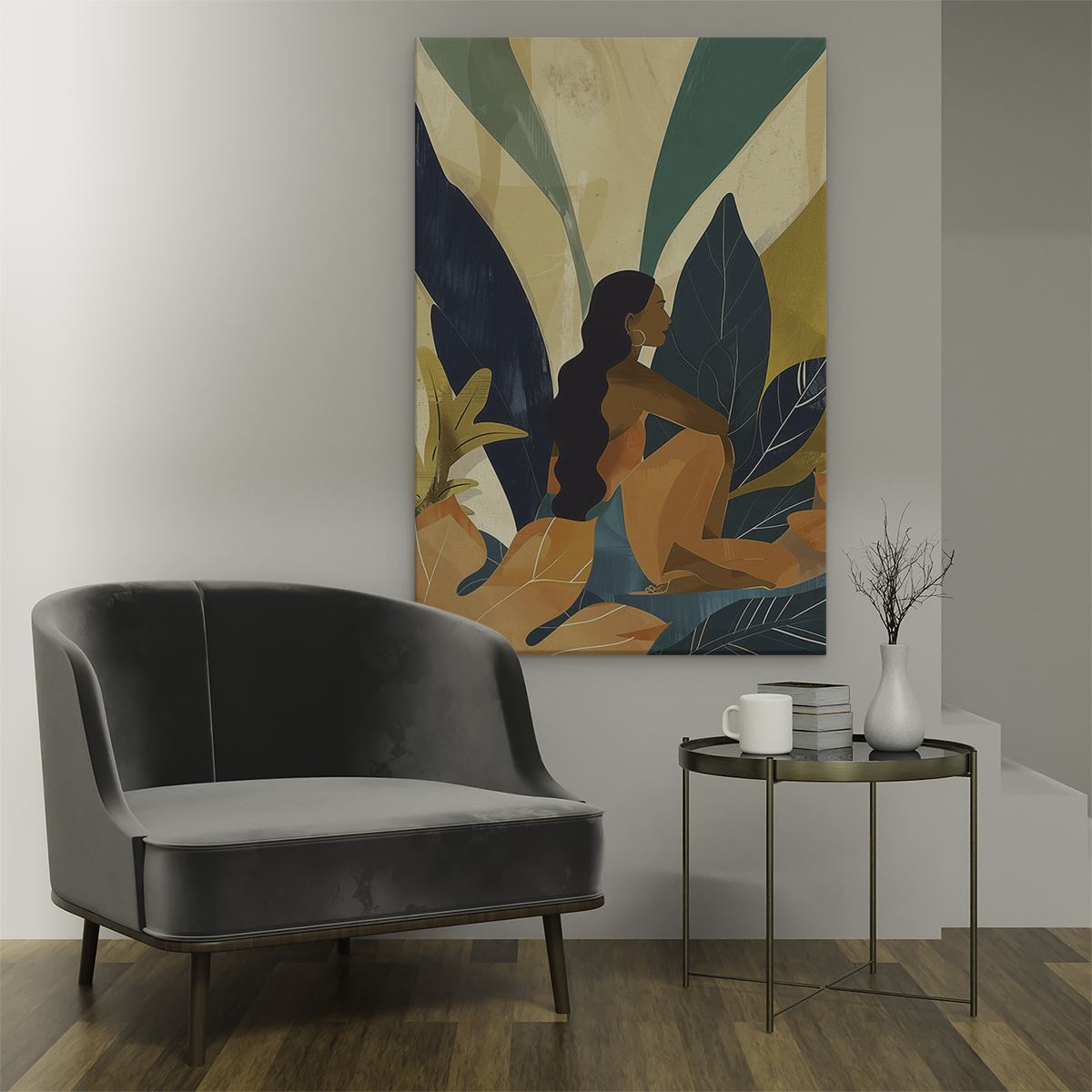 Schilderij Illustratie van een Vrouw die in Tropische Bladeren Zit