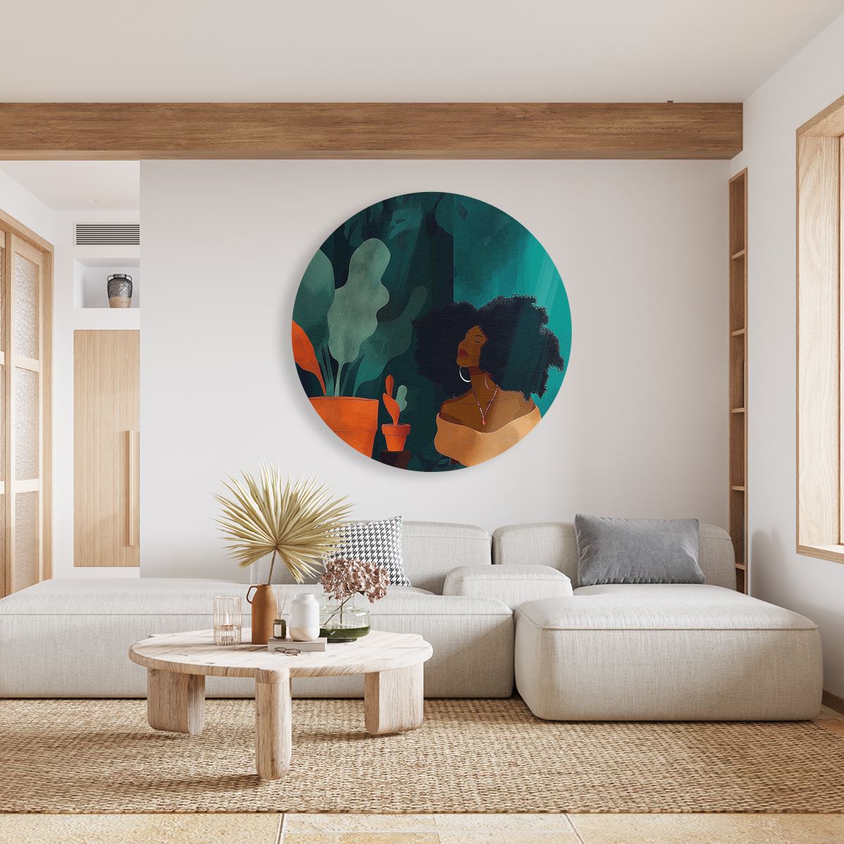 Wandcirkel Illustratie van een Vrouw met Afrohaar en een Potplant