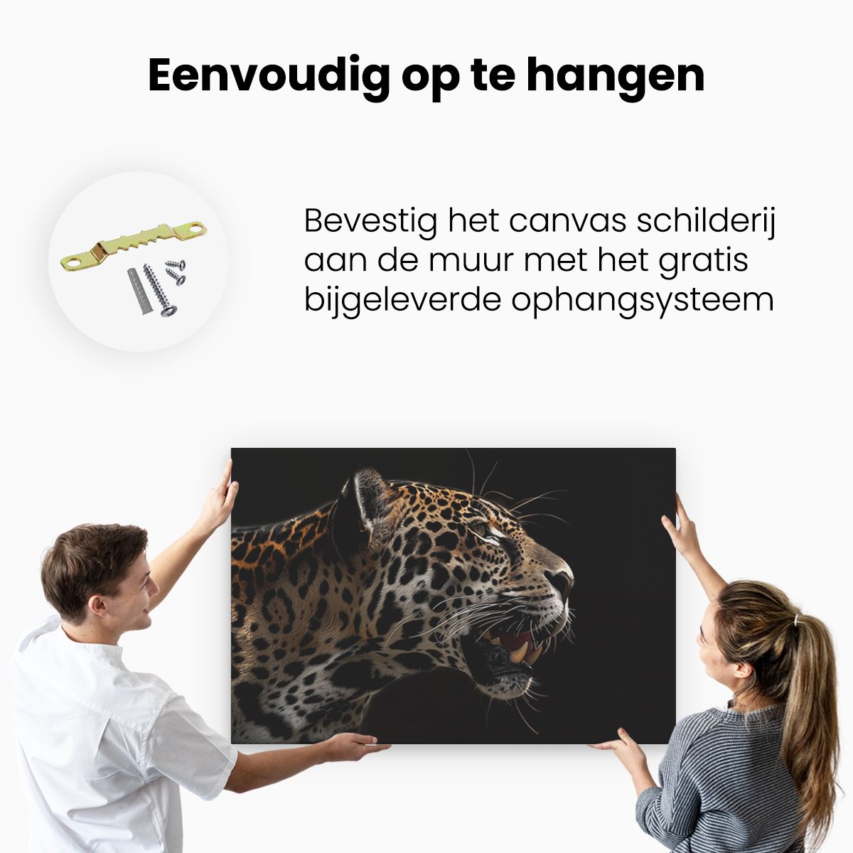 Bij aankoop ontvang je een meegeleverd ophangsysteem, zodat je op een simpele en snelle wijze het schilderij boven de bank of bed kan monteren.