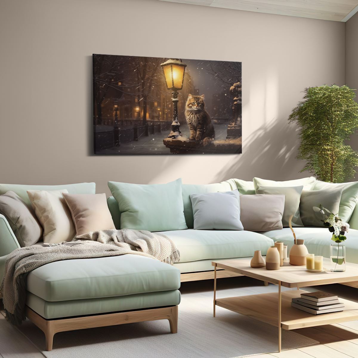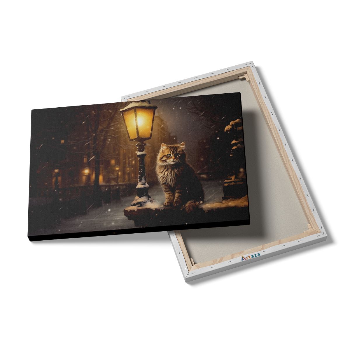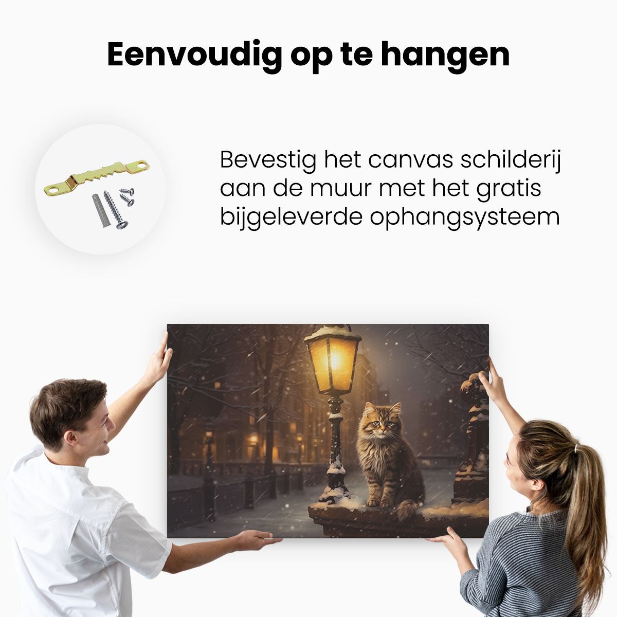 Schilderij Kat bij een Lantaarnpaal in de Winter