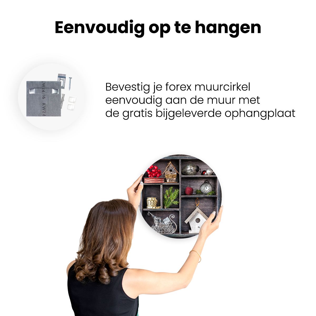 Gebruik het meegeleverde bevestigingsmateriaal om de wandcirkel aan de meeste wanden om te kunnen hangen. Een schroef en plug leveren we mee.