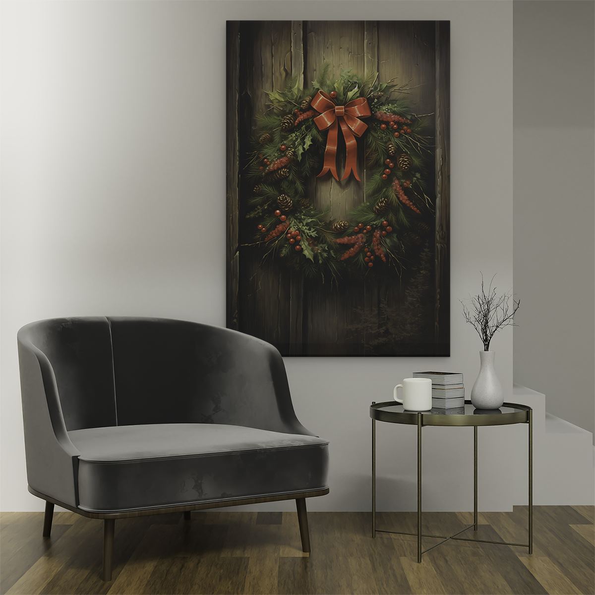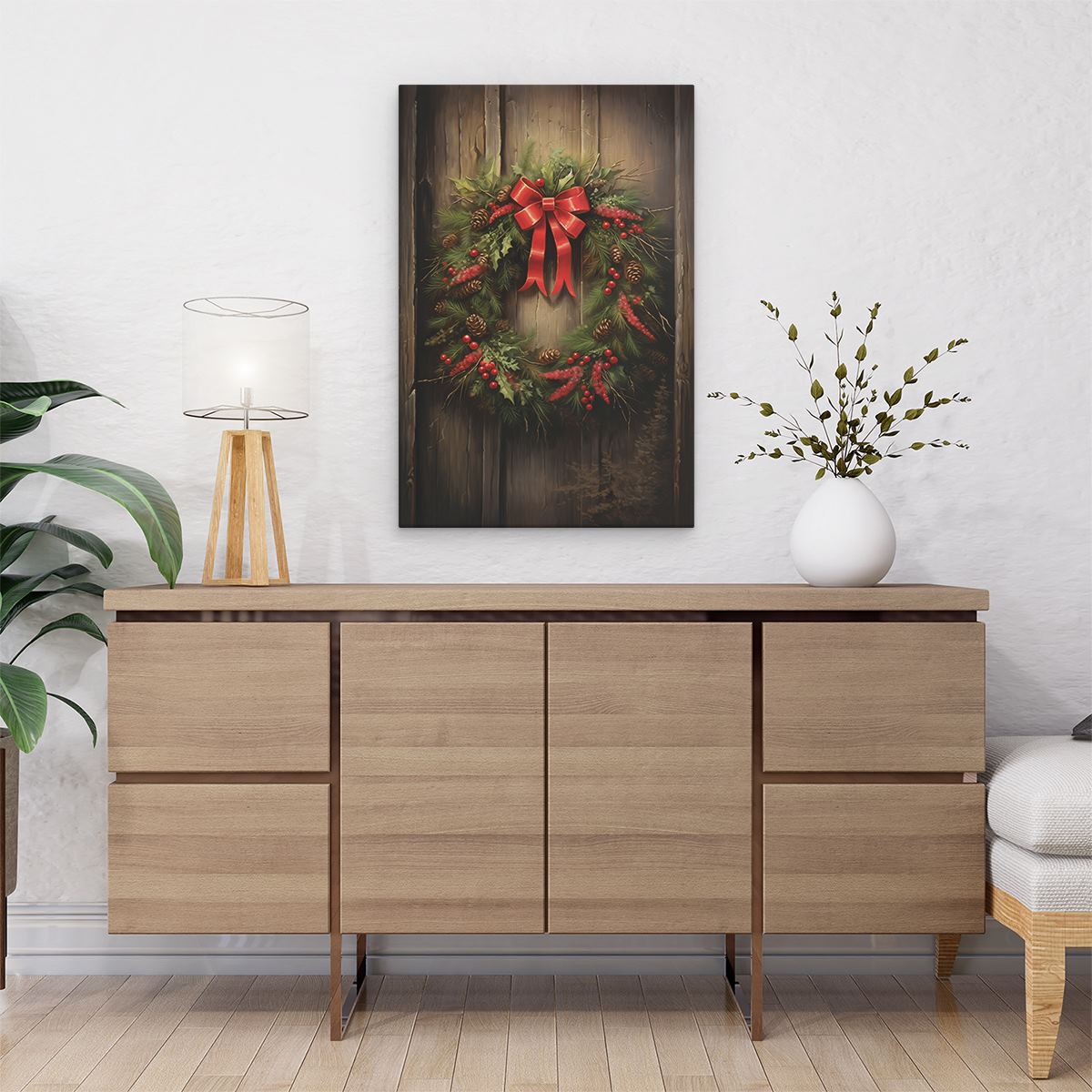 Schilderij Kerstkrans op een Houten Muur