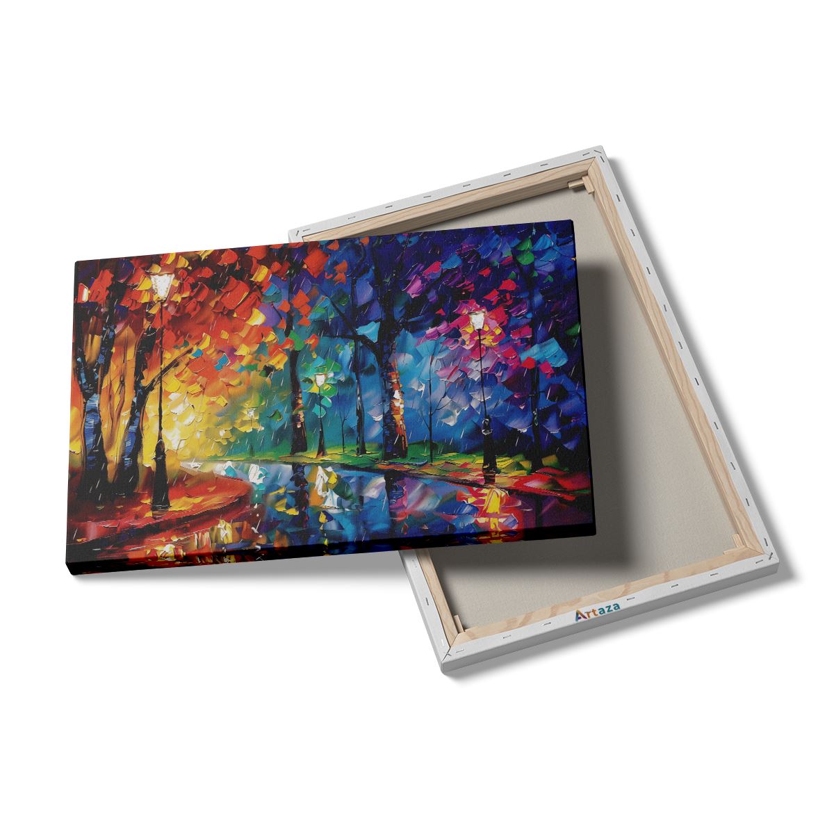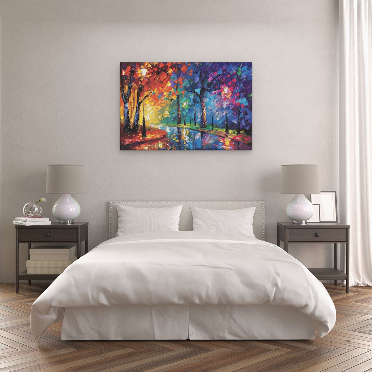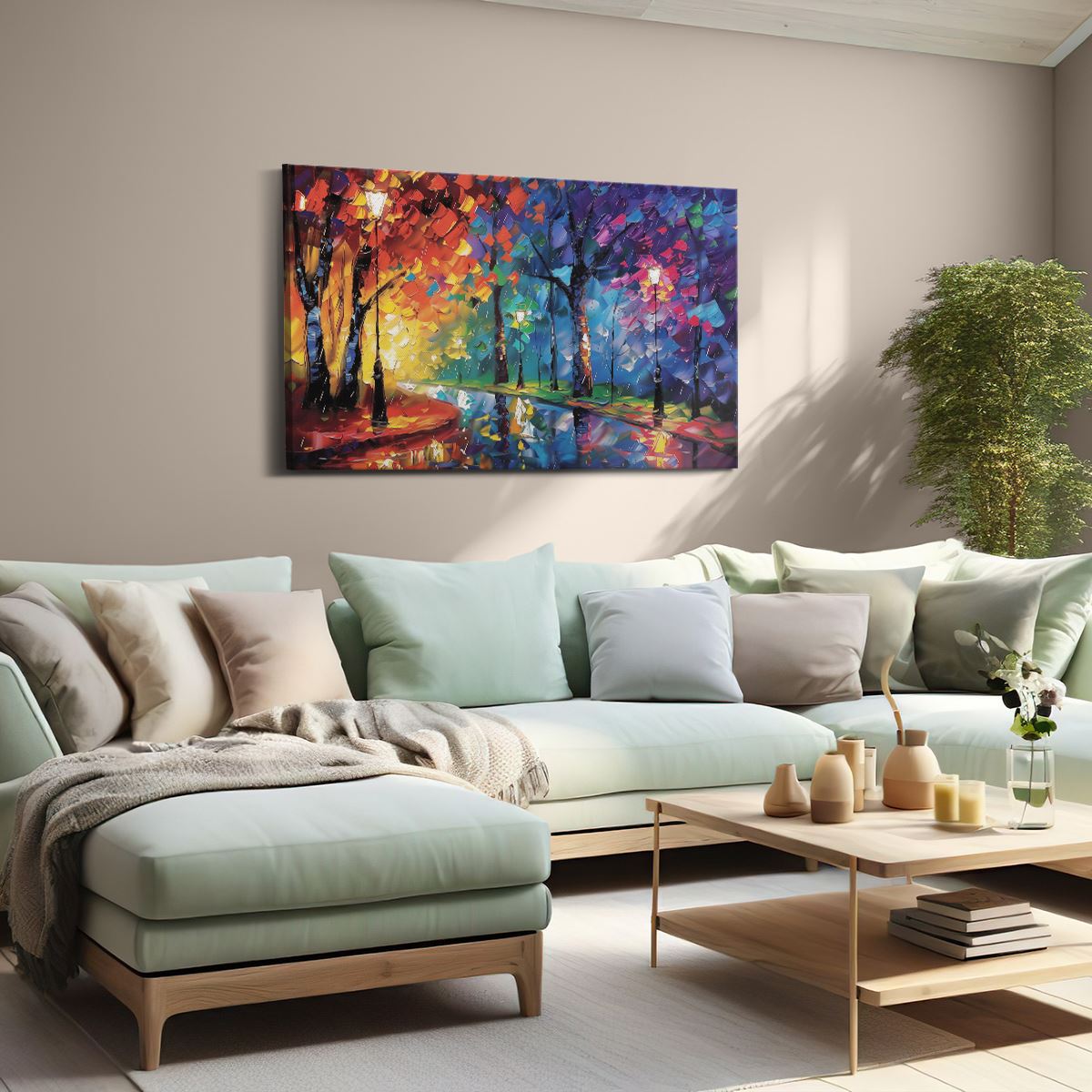 Schilderij Kleurrijk Kunstwerk van Bomen en Straatverlichting