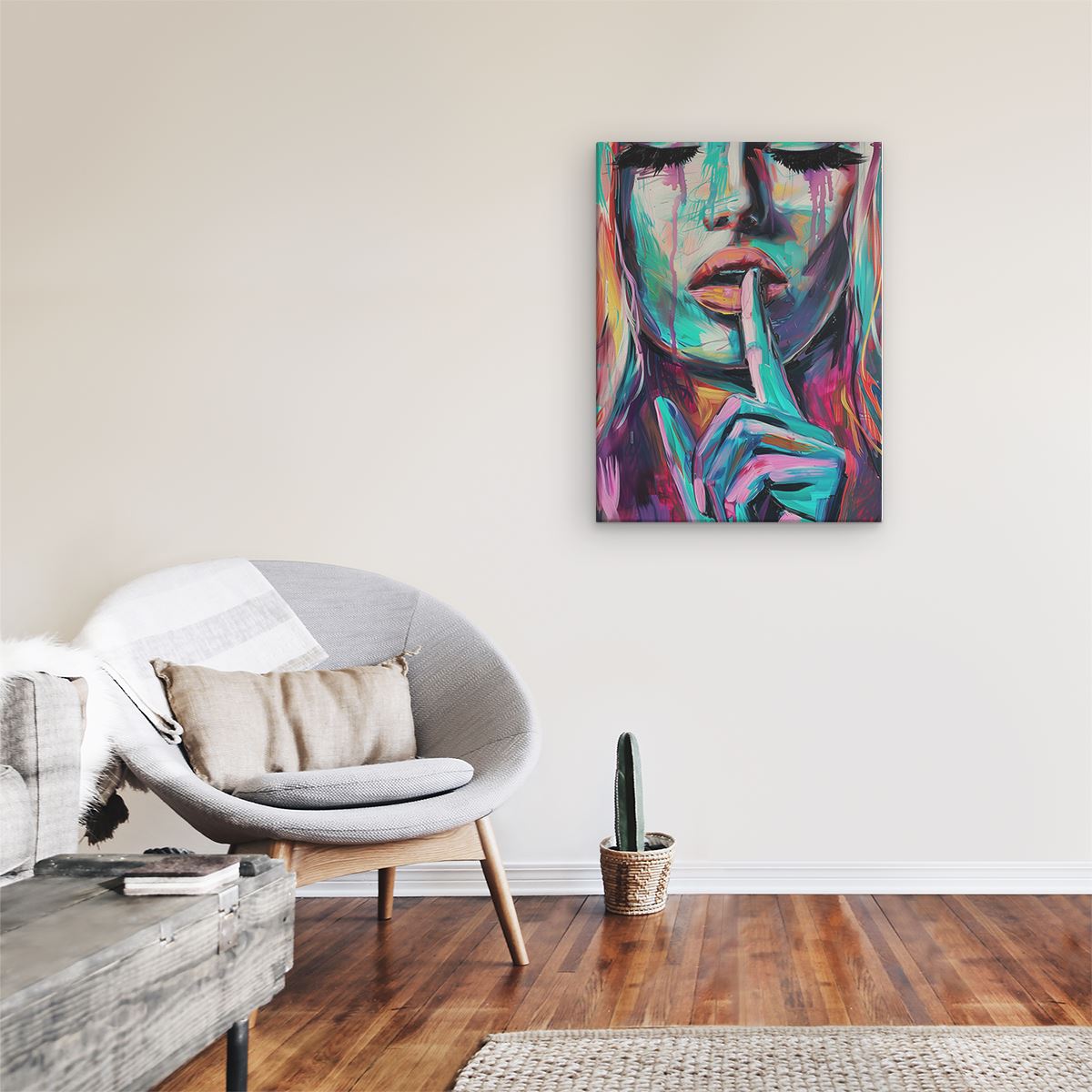Schilderij Kleurrijk Kunstwerk van een Vrouw met haar Vinger op haar Lippen