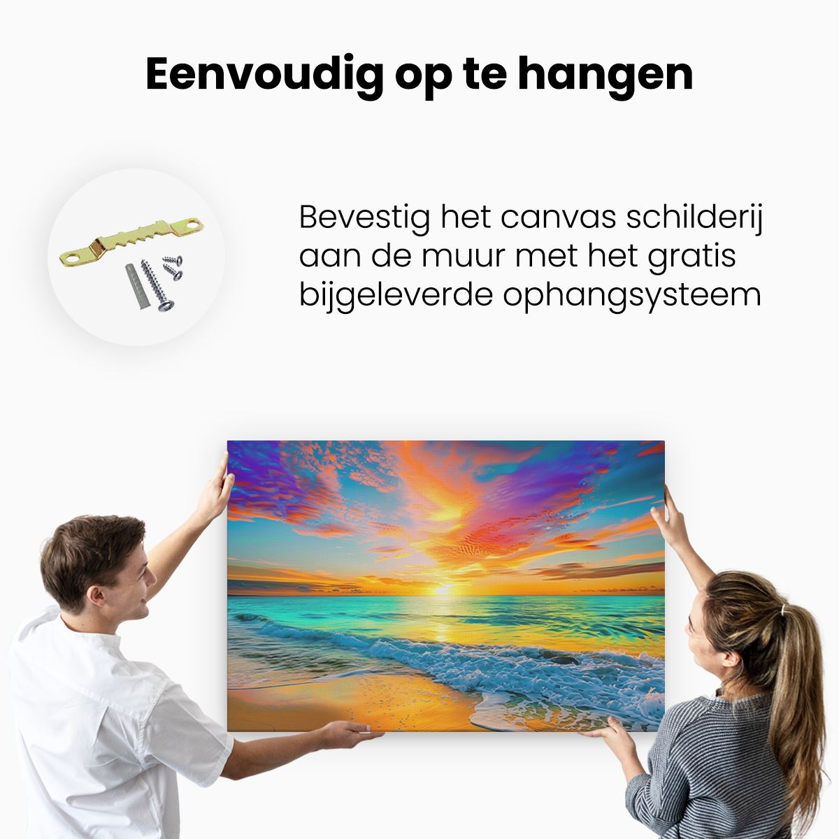 Bij aankoop ontvang je een meegeleverd ophangsysteem, zodat je op een simpele en snelle wijze het schilderij boven de bank of bed kan monteren.