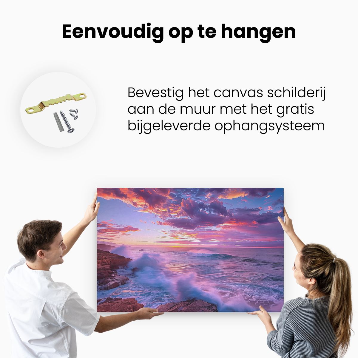 Bij aankoop ontvang je een meegeleverd ophangsysteem, zodat je op een simpele en snelle wijze het schilderij boven de bank of bed kan monteren.