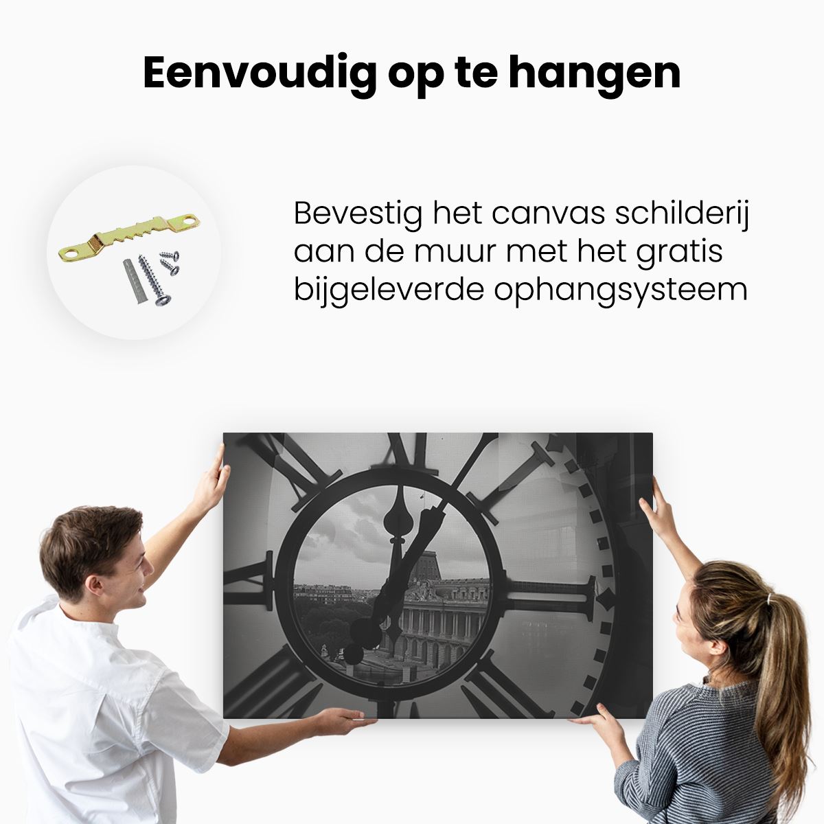 Bij aankoop ontvang je een meegeleverd ophangsysteem, zodat je op een simpele en snelle wijze het schilderij boven de bank of bed kan monteren.