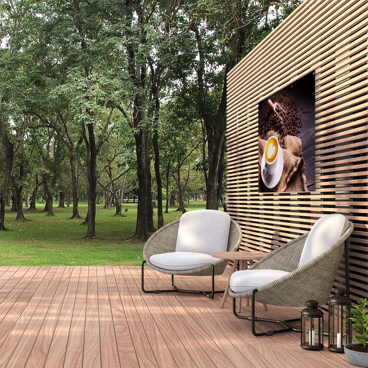Tuinposter Kopje Koffie In Een Hartje Met Koffiebonen