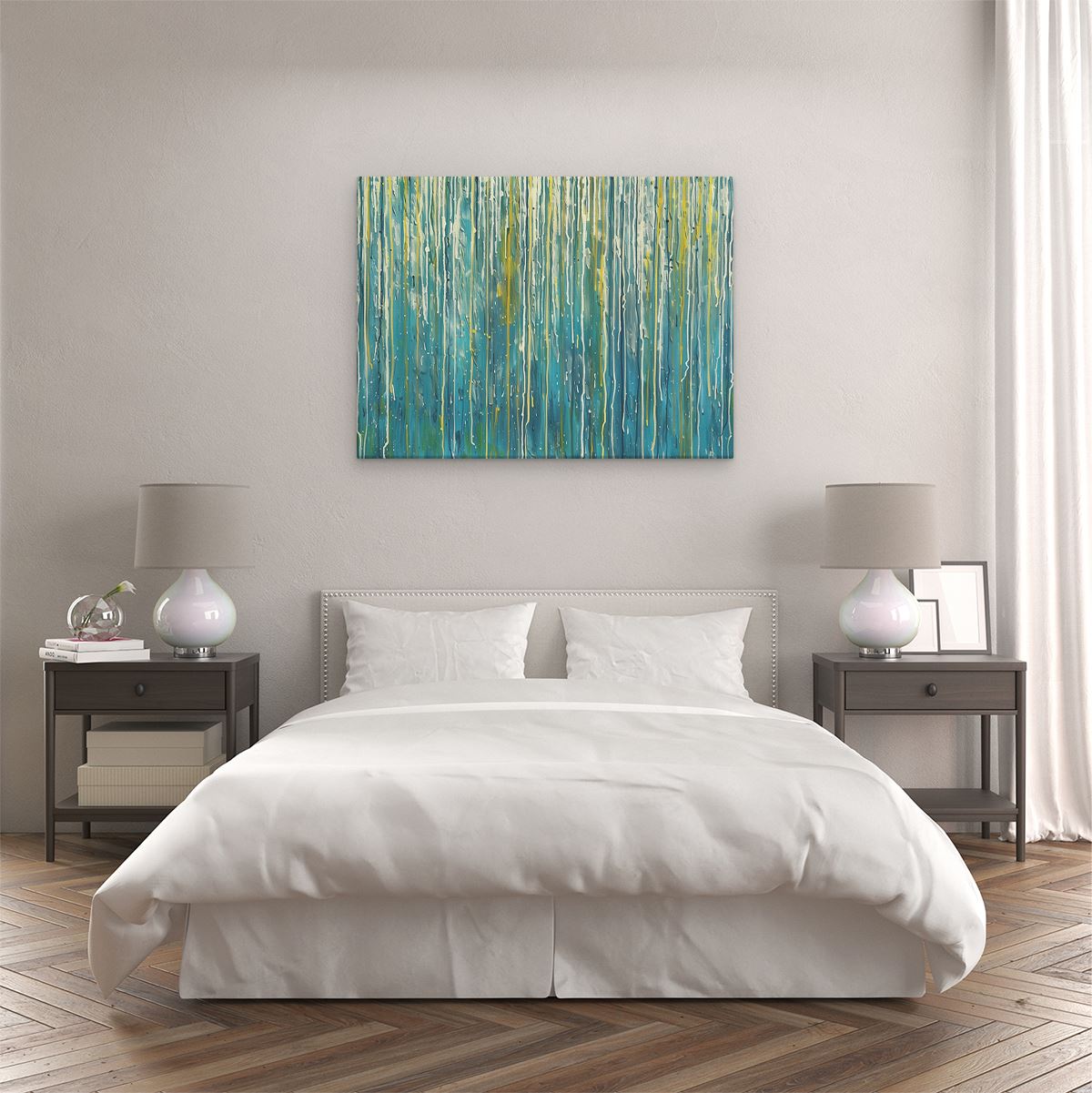 Bij aankoop ontvang je een meegeleverd ophangsysteem, zodat je op een simpele en snelle wijze het schilderij boven de bank of bed kan monteren.