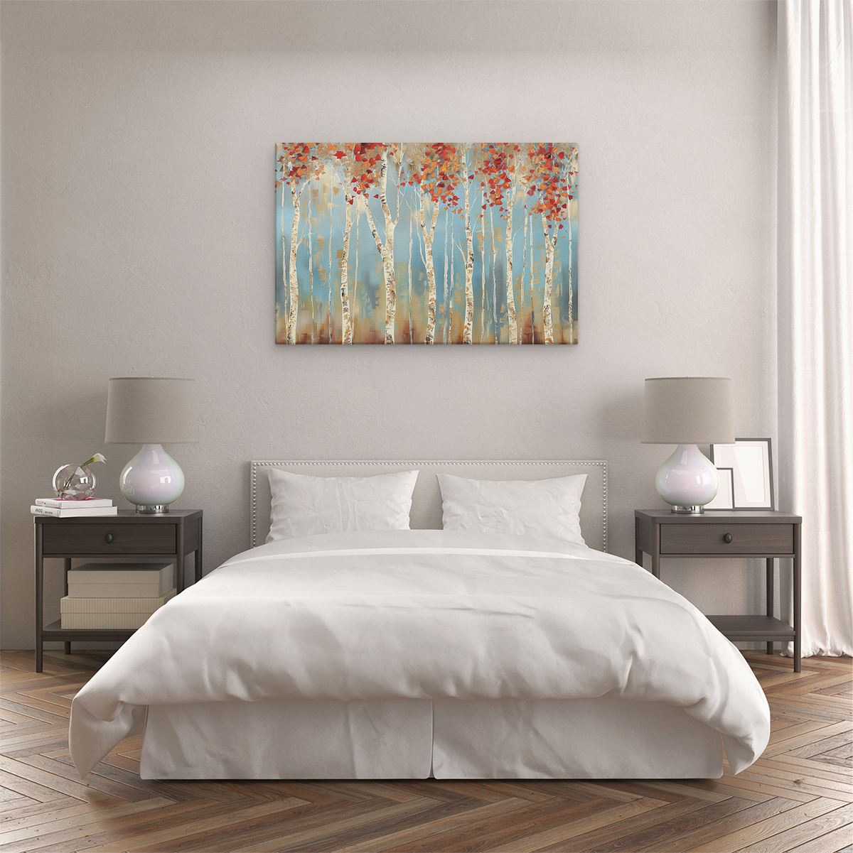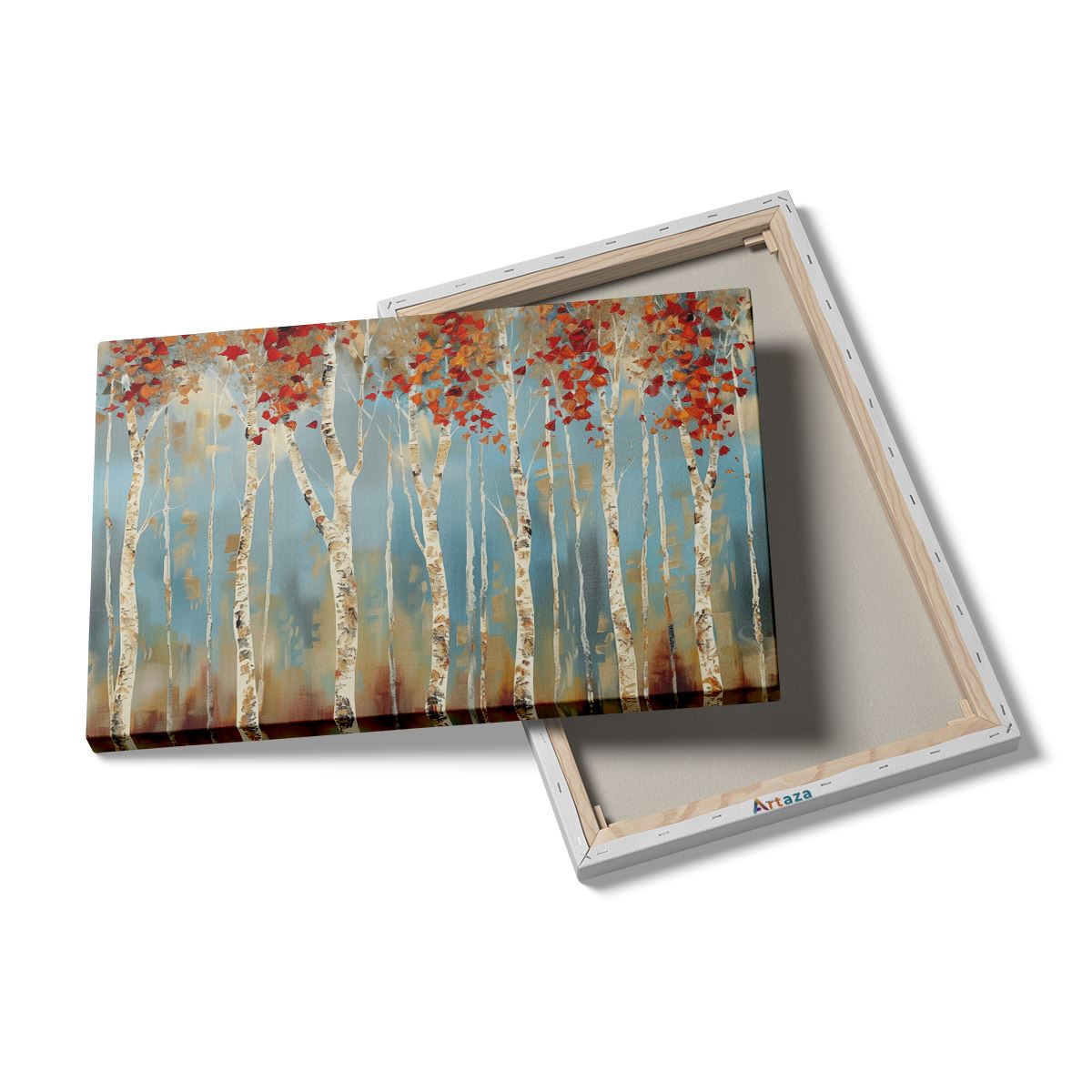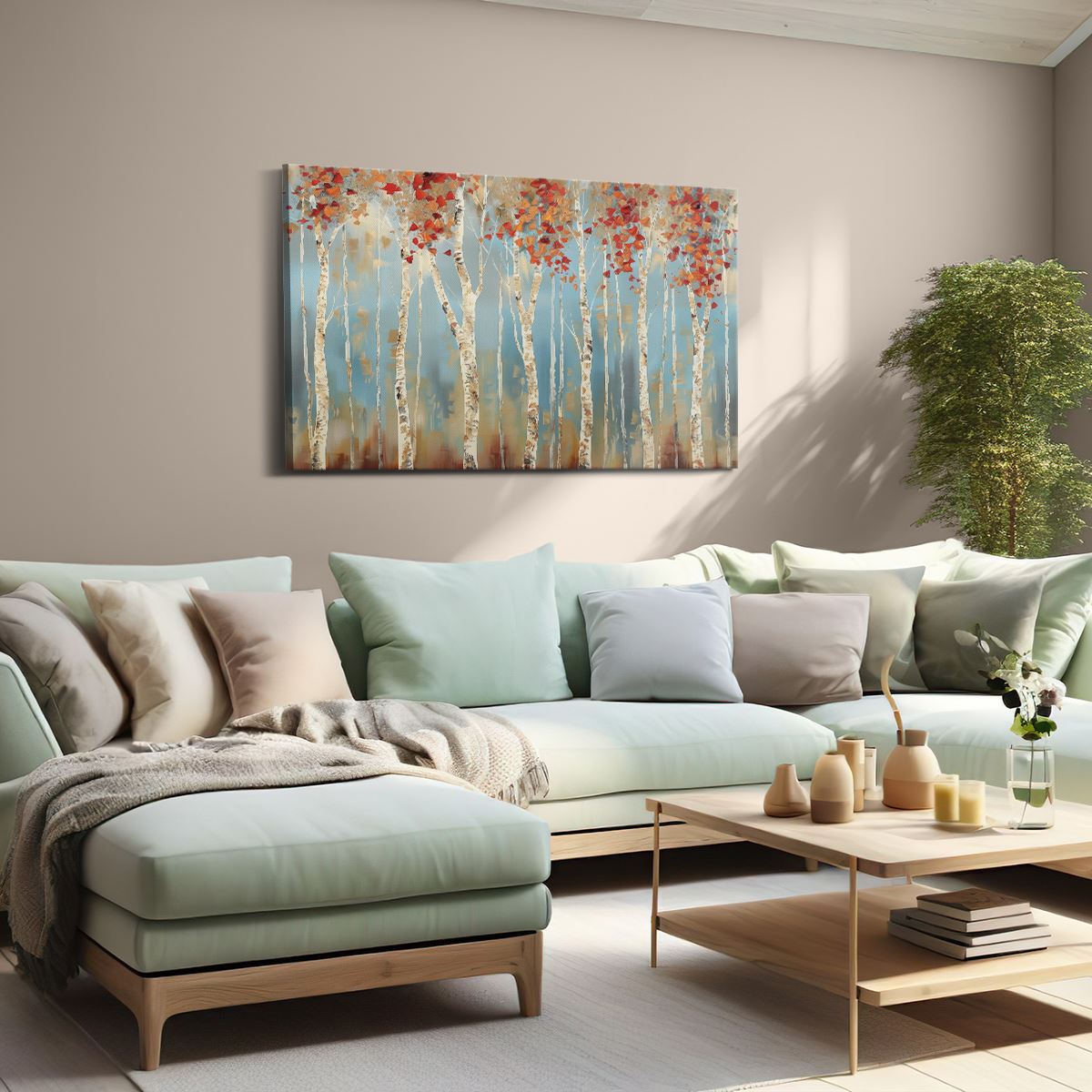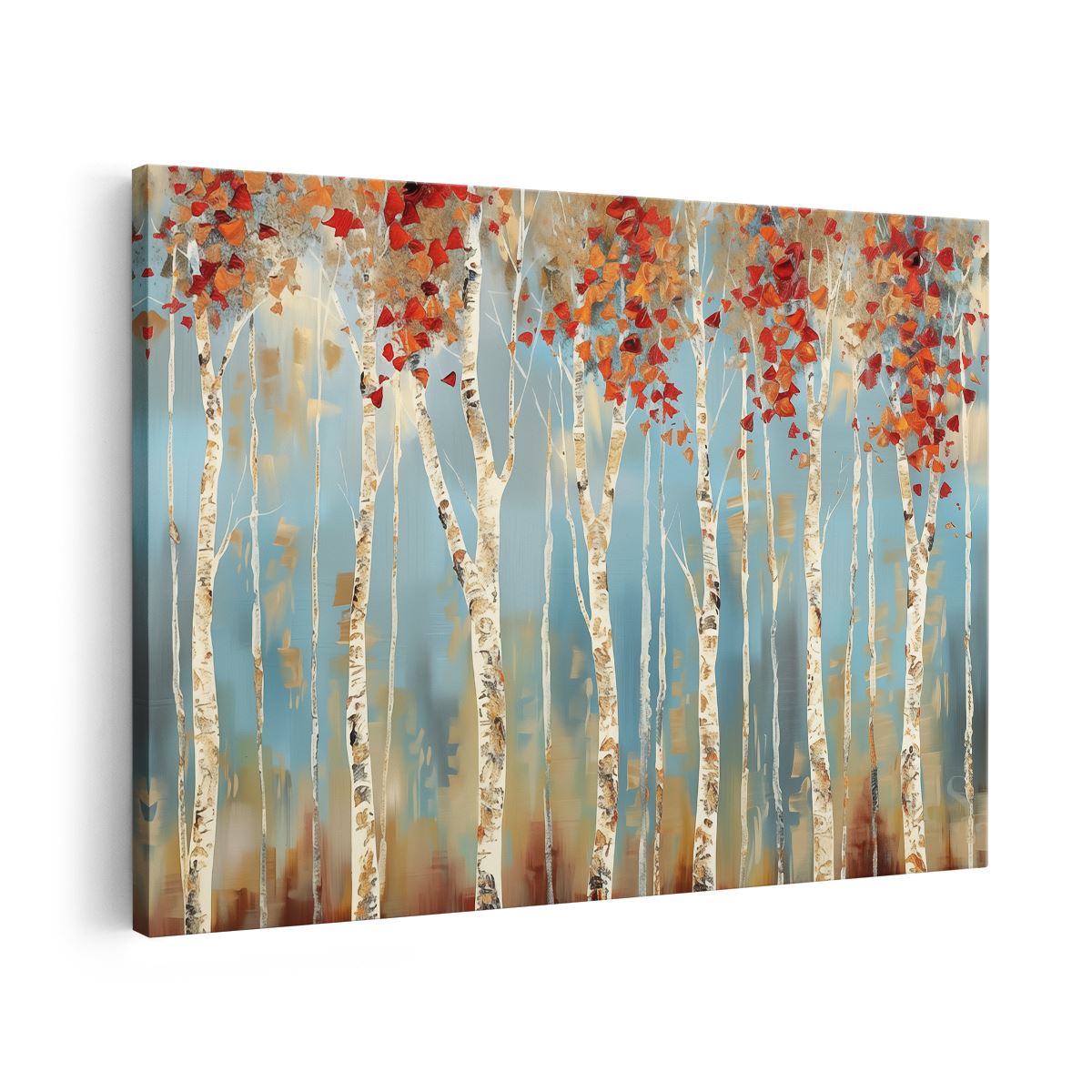 Schilderij Kunstwerk van Berkenbomen met Rode en Oranje Bladeren