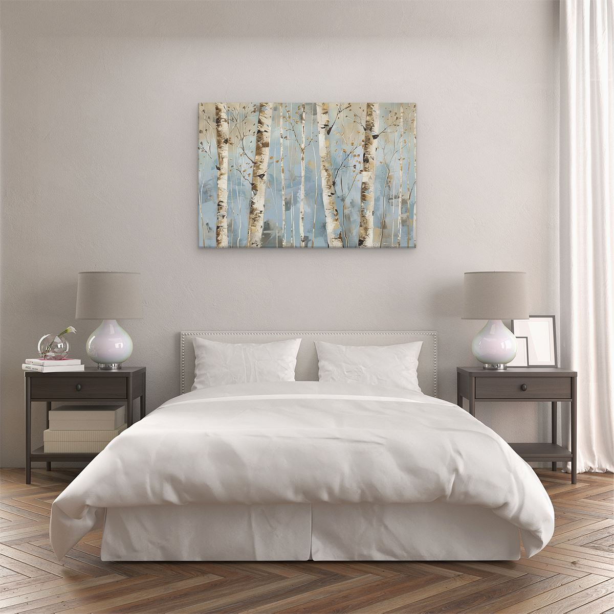 Schilderij Kunstwerk van Berkenbomen op een Blauwe Achtergrond