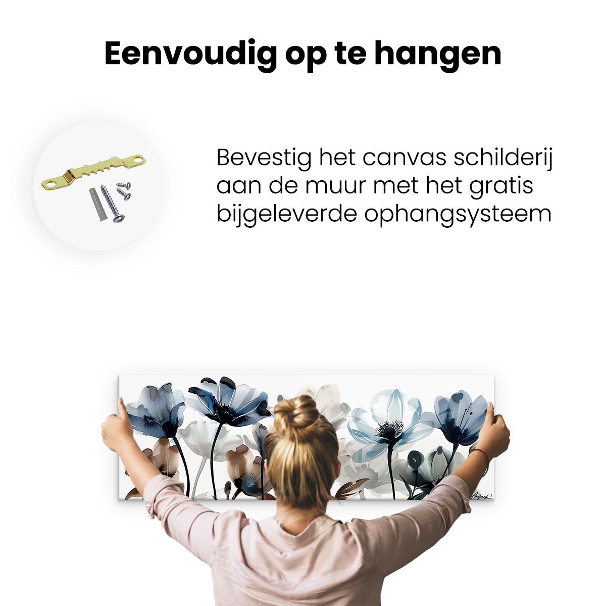 Bij aankoop ontvang je een meegeleverd ophangsysteem, zodat je op een simpele en snelle wijze het schilderij boven de bank of bed kan monteren.