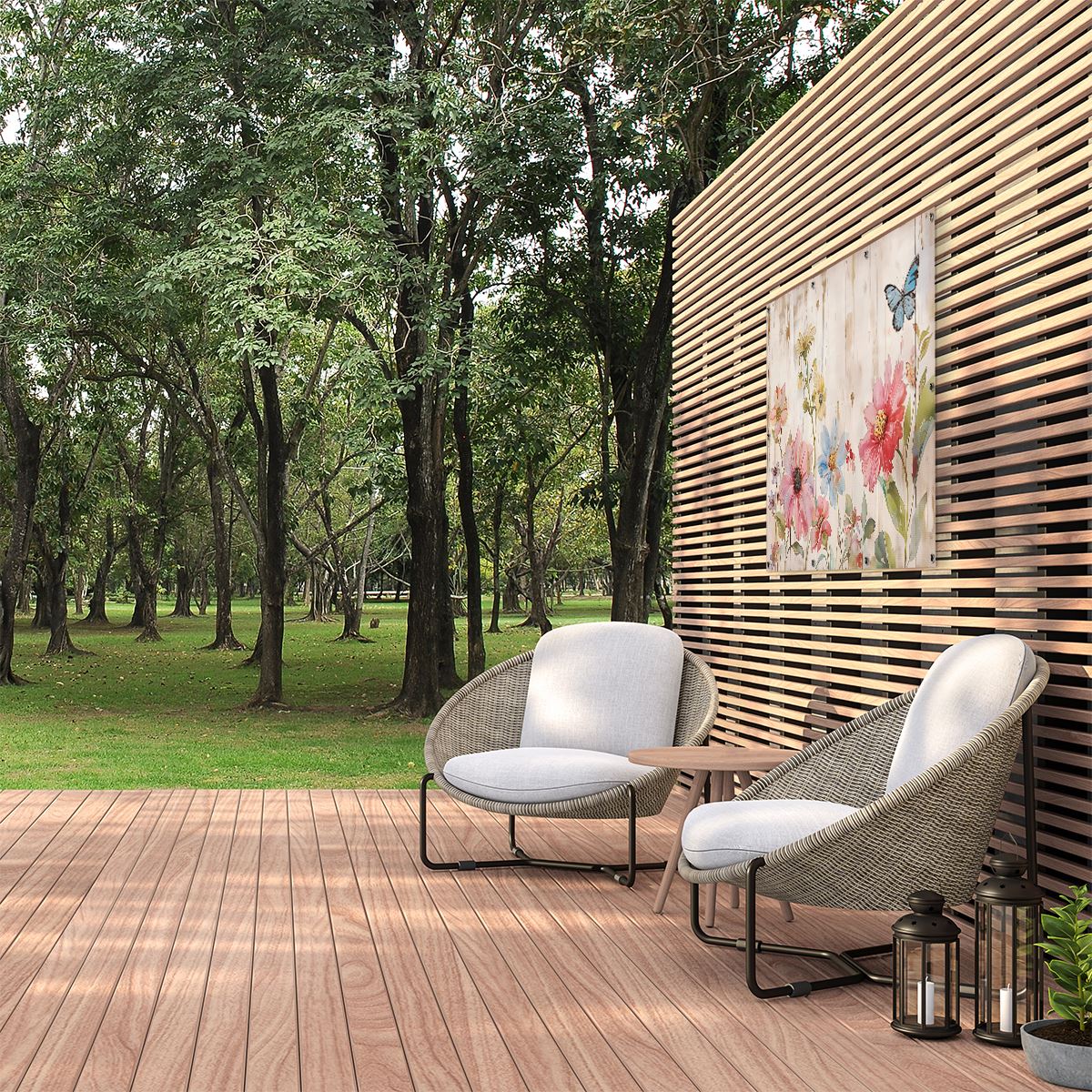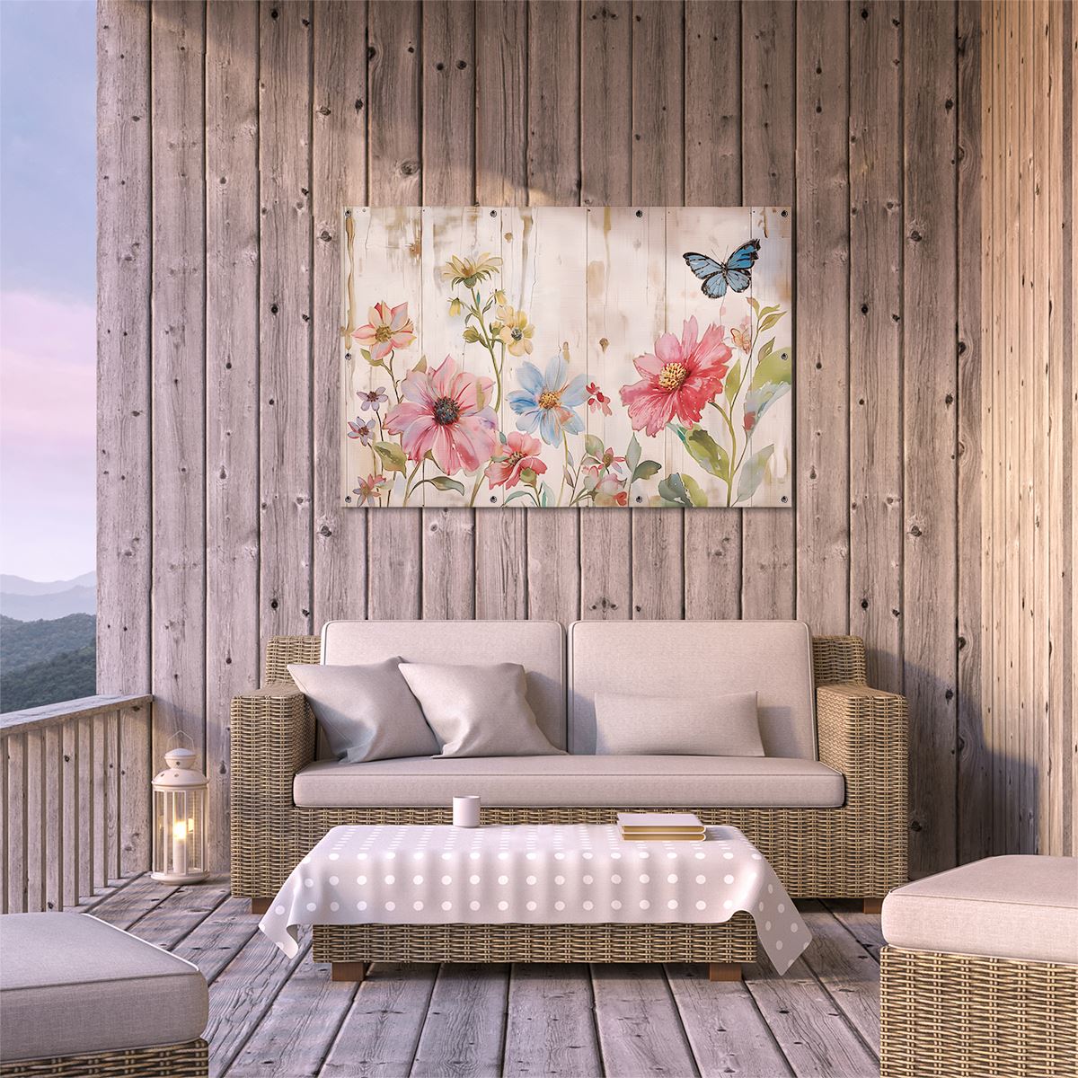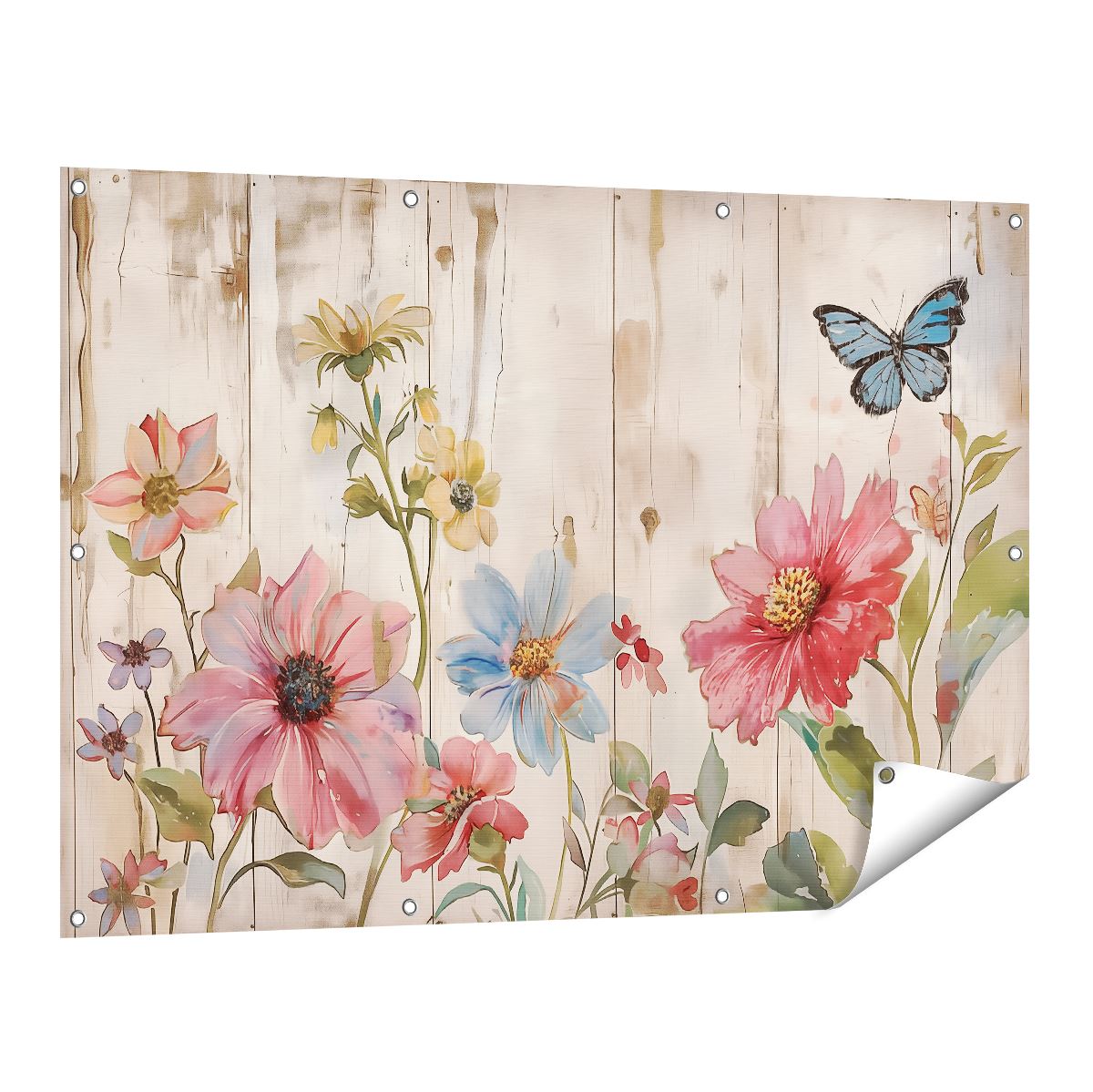 Tuinposter Kunstwerk van Bloemen en een Vlinder op een Houten Muur