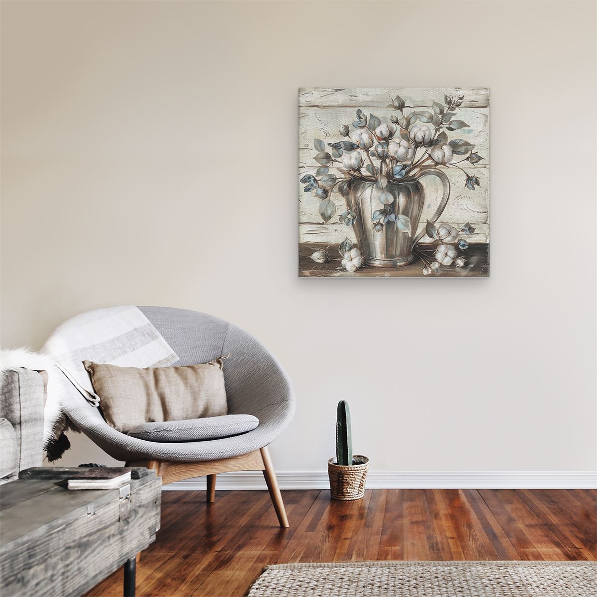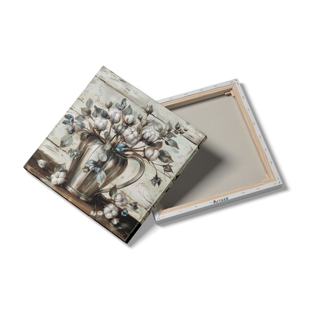Schilderij Kunstwerk van Bloemen in een Zilveren Kan op een Houten Tafel
