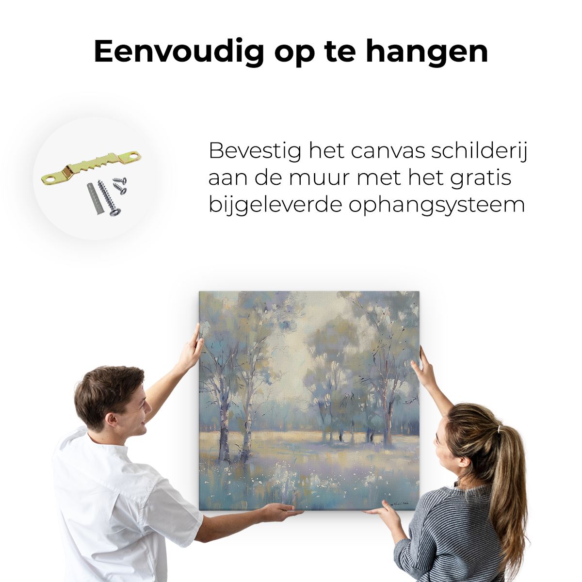 Bij aankoop ontvang je een meegeleverd ophangsysteem, zodat je op een simpele en snelle wijze het schilderij boven de bank of bed kan monteren.
