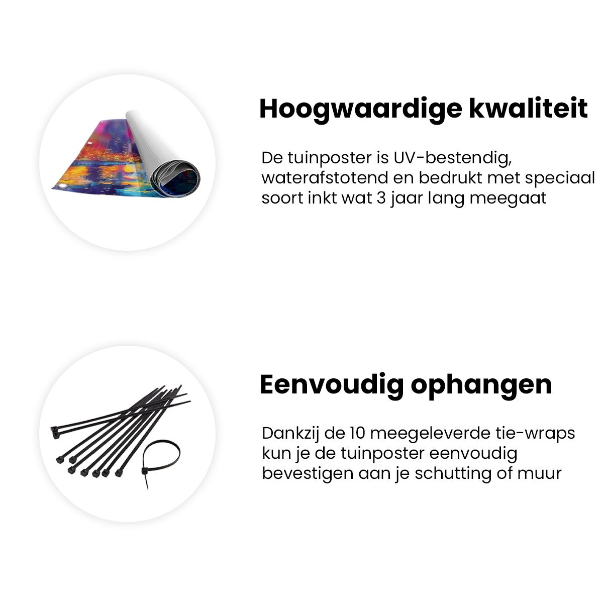 Bij aankoop ontvang je een meegeleverd ophangsysteem, zodat je op een simpele en snelle wijze de tuinposter kan ophangen.