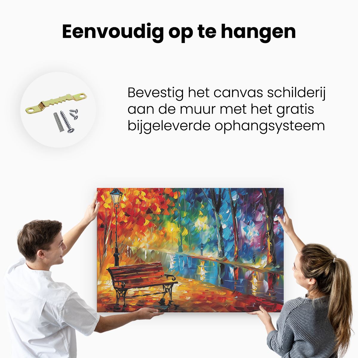 Bij aankoop ontvang je een meegeleverd ophangsysteem, zodat je op een simpele en snelle wijze het schilderij boven de bank of bed kan monteren.