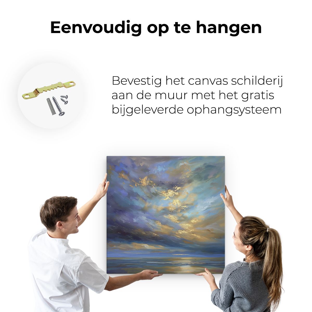 Bij aankoop ontvang je een meegeleverd ophangsysteem, zodat je op een simpele en snelle wijze het schilderij boven de bank of bed kan monteren.