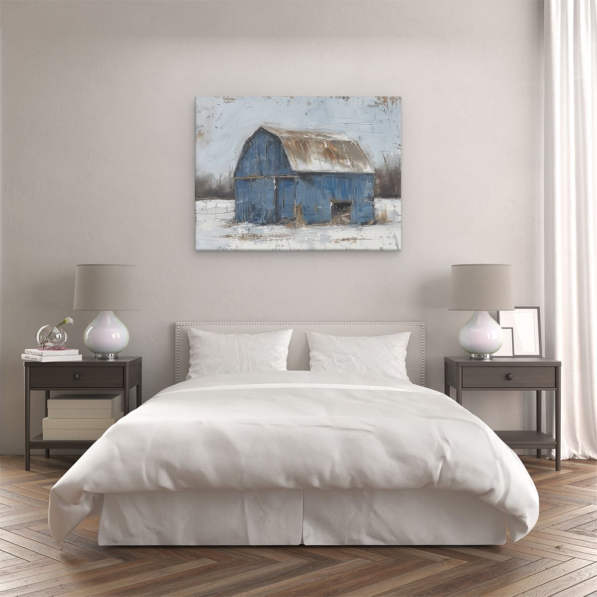 Schilderij Kunstwerk van een Blauwe Schuur in de Sneeuw