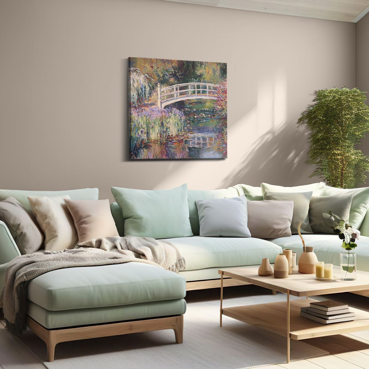 Schilderij Kunstwerk van een Brug over een Vijver