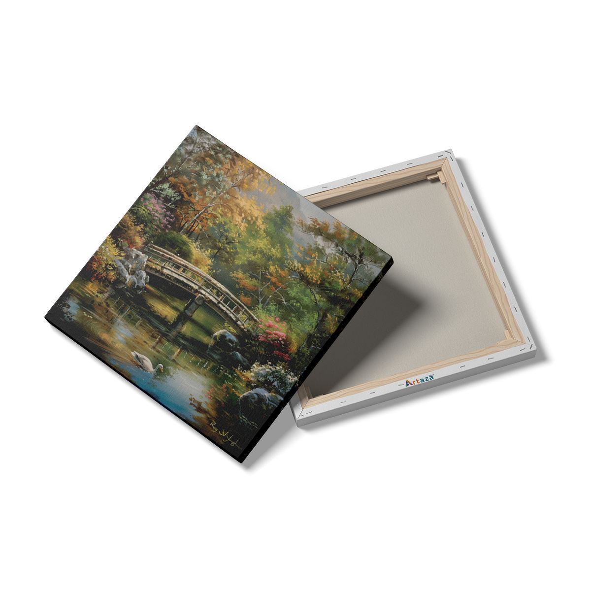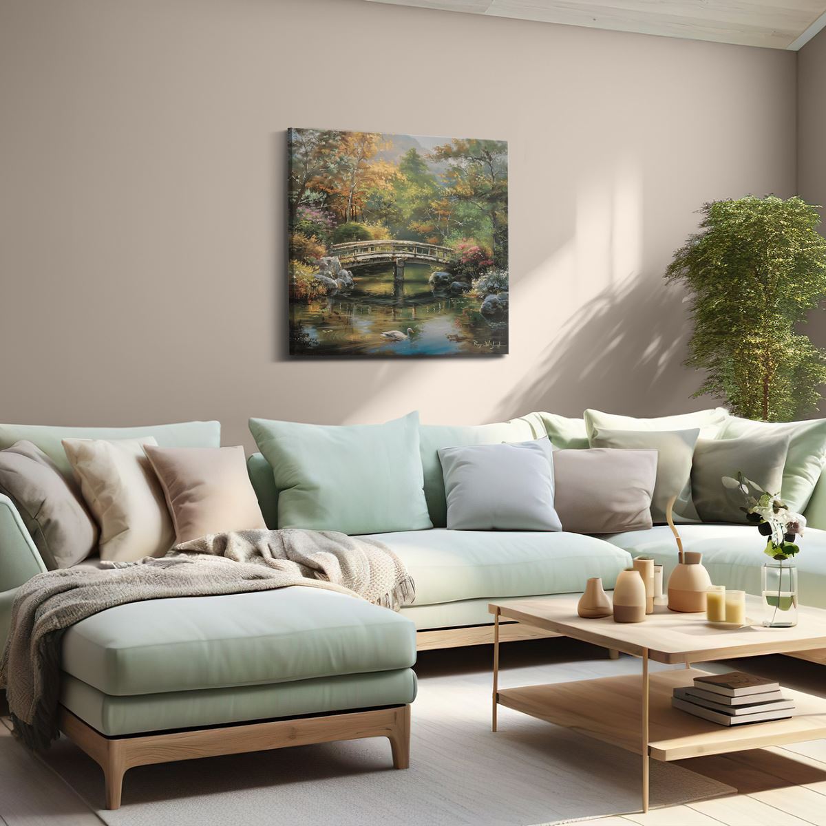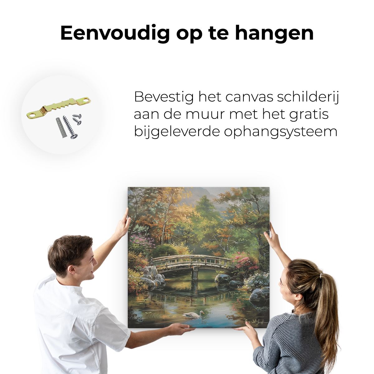 Schilderij Kunstwerk van een Brug over een Vijver met Zwanen