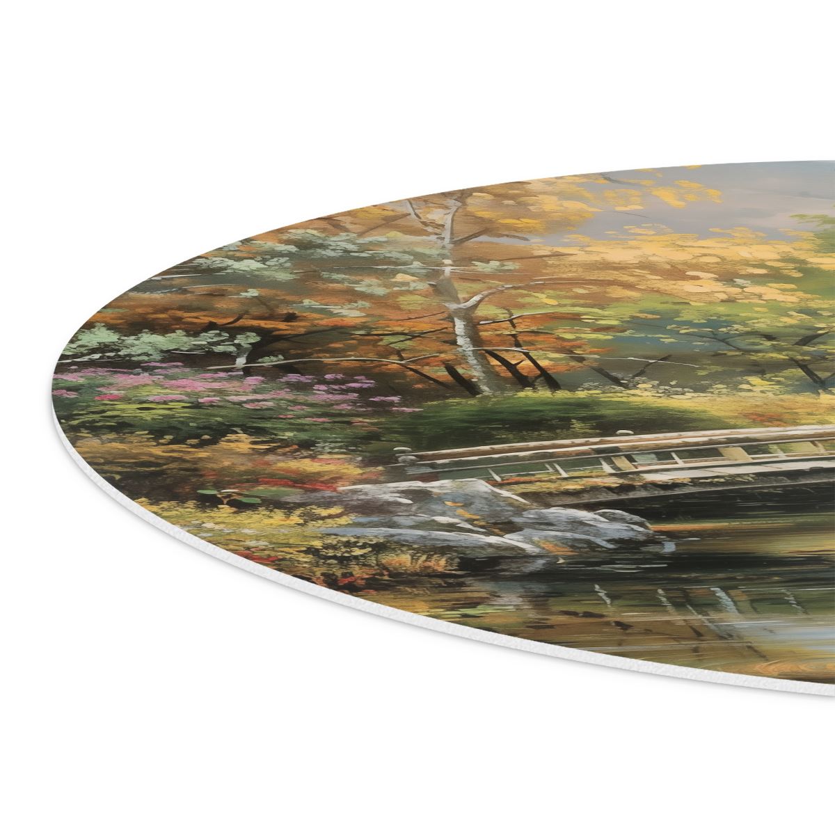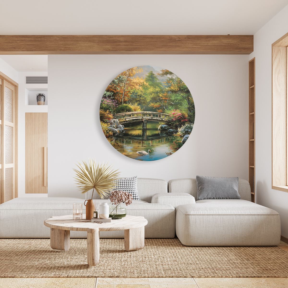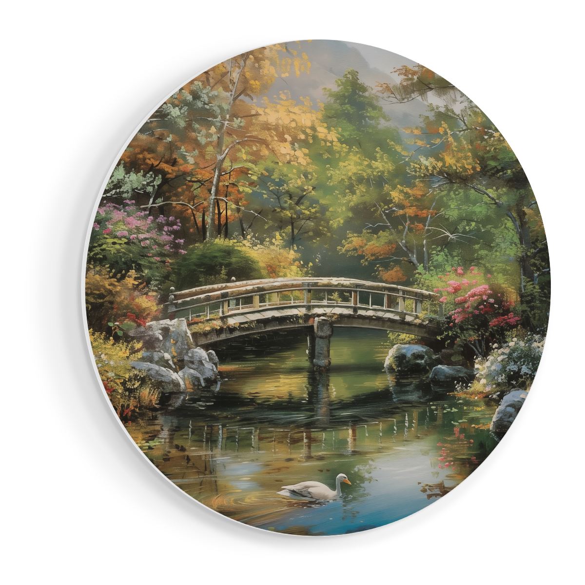 Wandcirkel Kunstwerk van een Brug over een Vijver met Zwanen