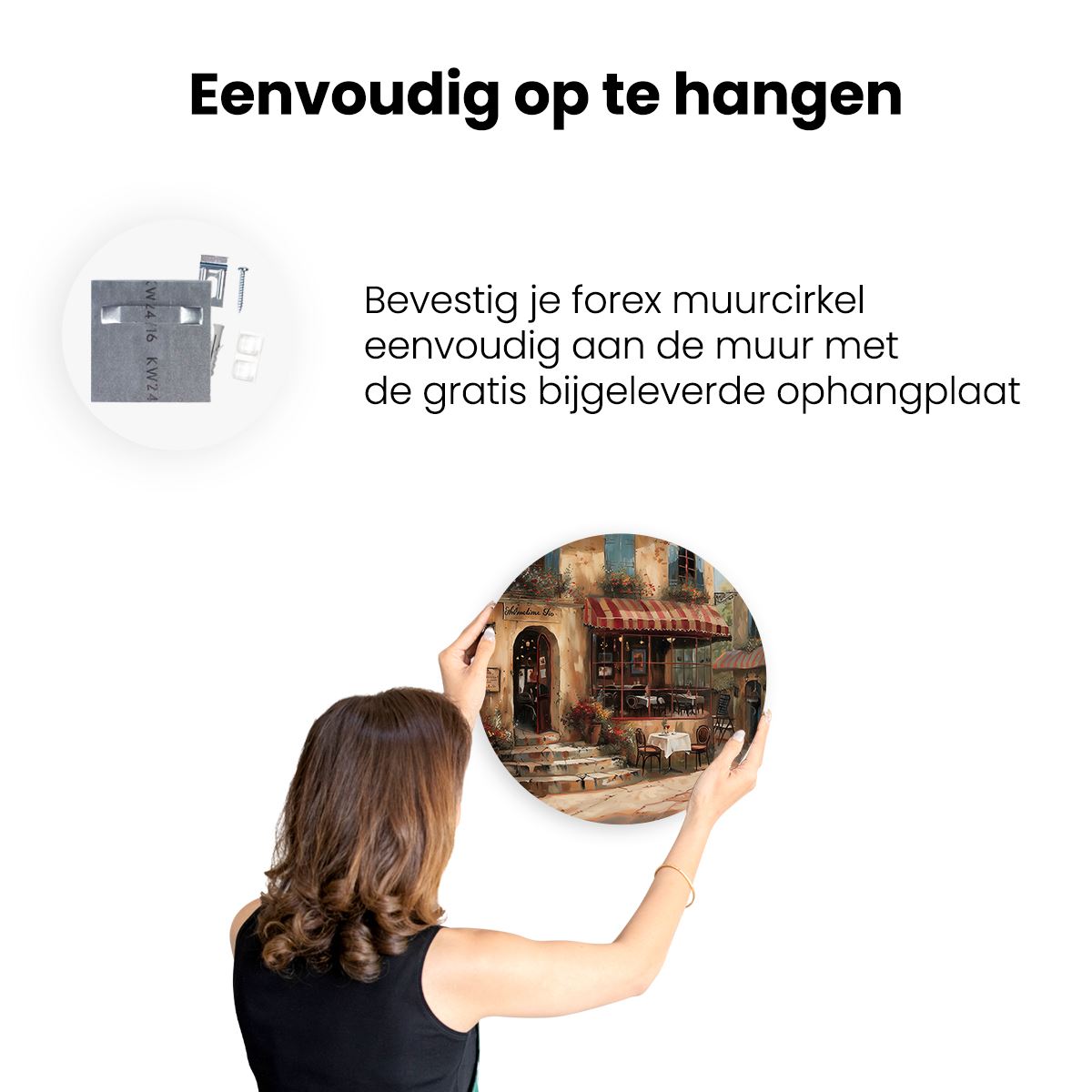 Gebruik het meegeleverde bevestigingsmateriaal om de wandcirkel aan de meeste wanden om te kunnen hangen. Een schroef en plug leveren we mee.