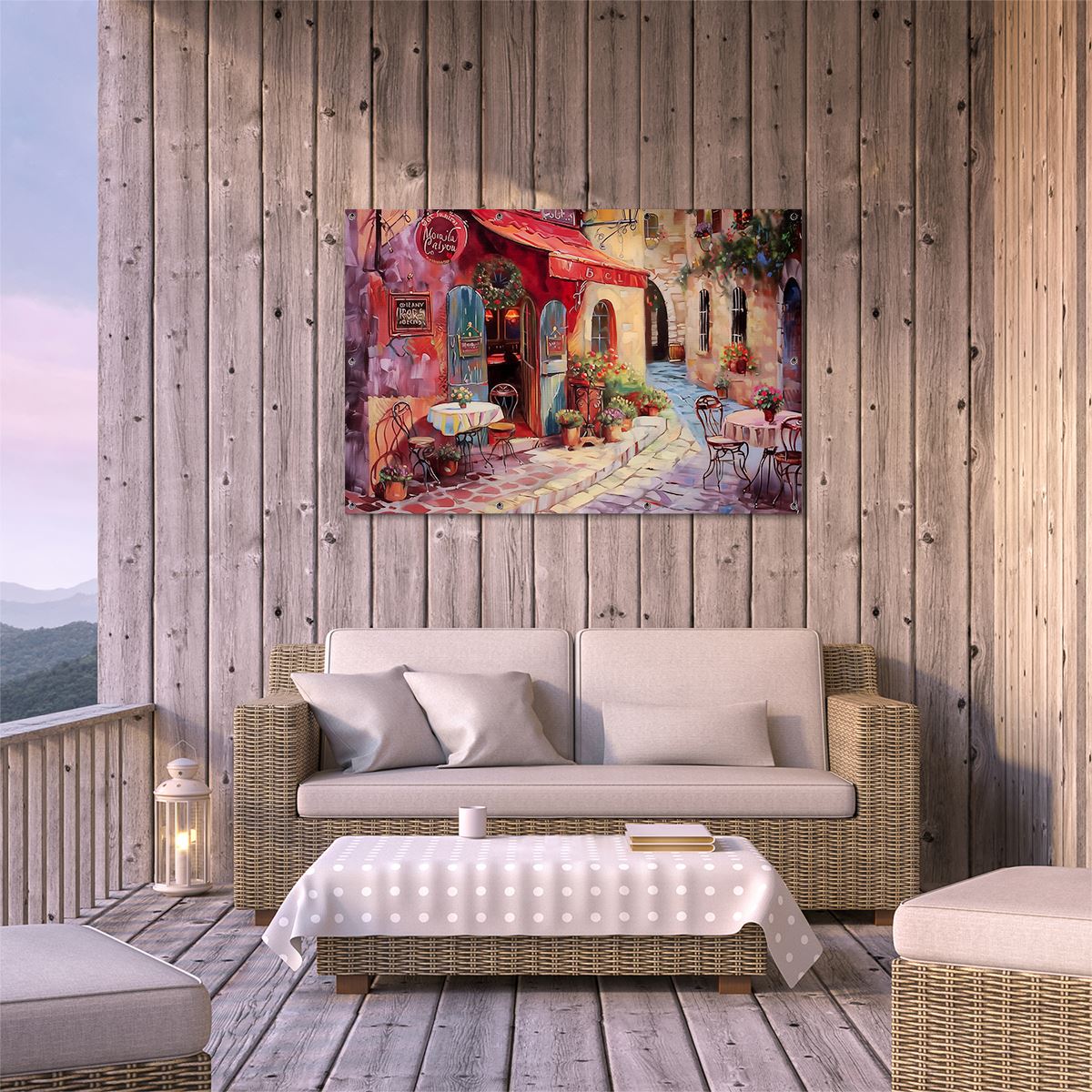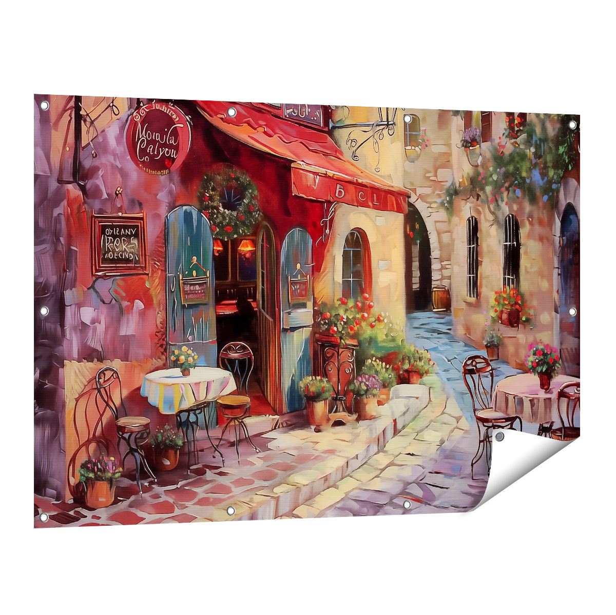 Tuinposter Kunstwerk van een Café met Tafels en Stoelen