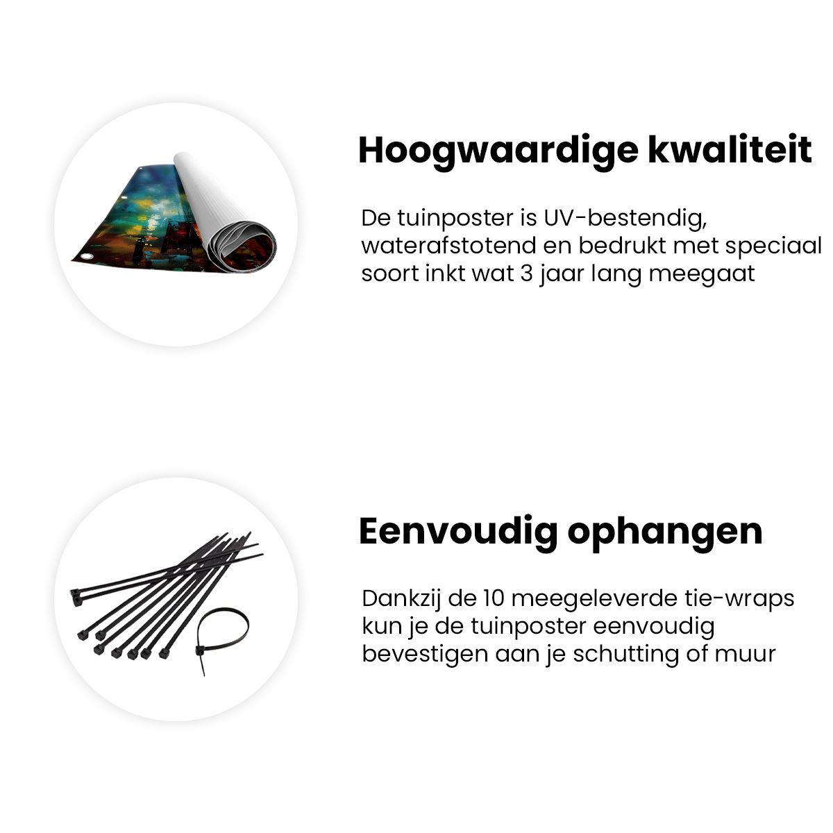 Bij aankoop ontvang je een meegeleverd ophangsysteem, zodat je op een simpele en snelle wijze de tuinposter kan ophangen.