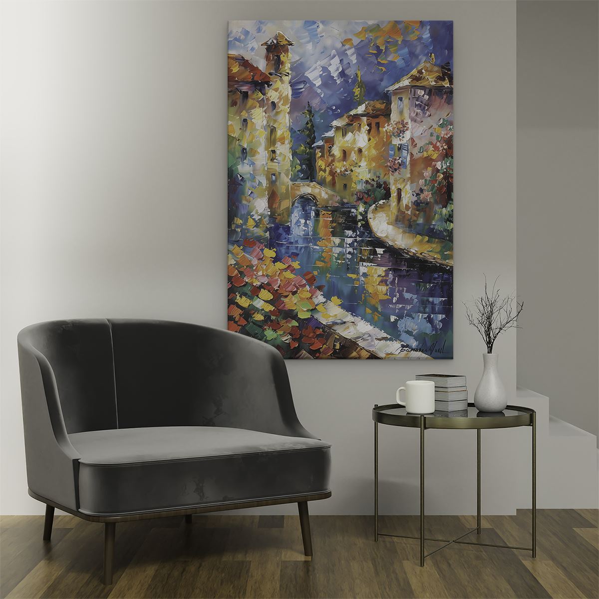 Schilderij Kunstwerk van een Gracht met Huizen en Bloemen