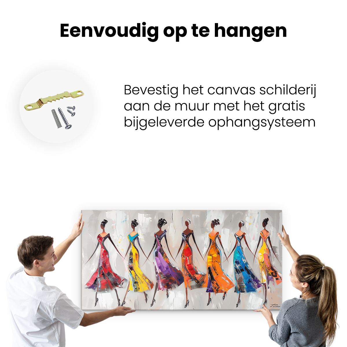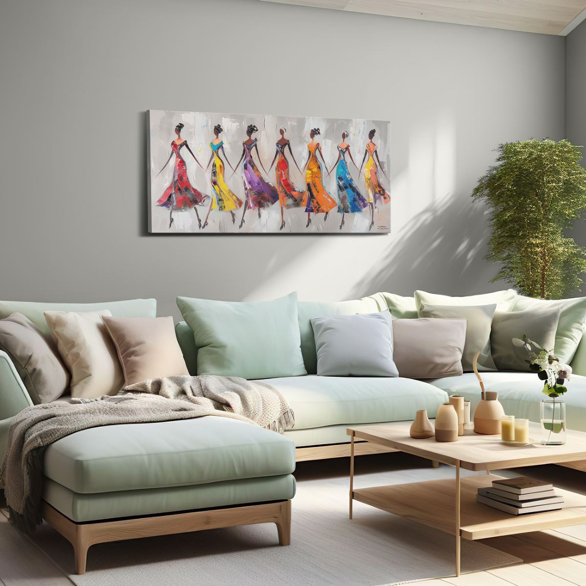 Schilderij Kunstwerk van een Groep Vrouwen in Kleurrijke Jurken