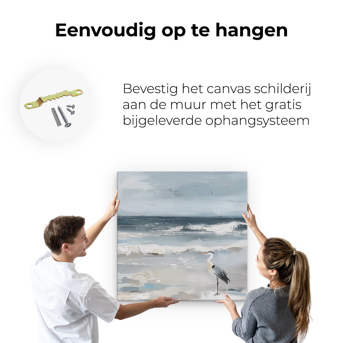 Bij aankoop ontvang je een meegeleverd ophangsysteem, zodat je op een simpele en snelle wijze het schilderij boven de bank of bed kan monteren.