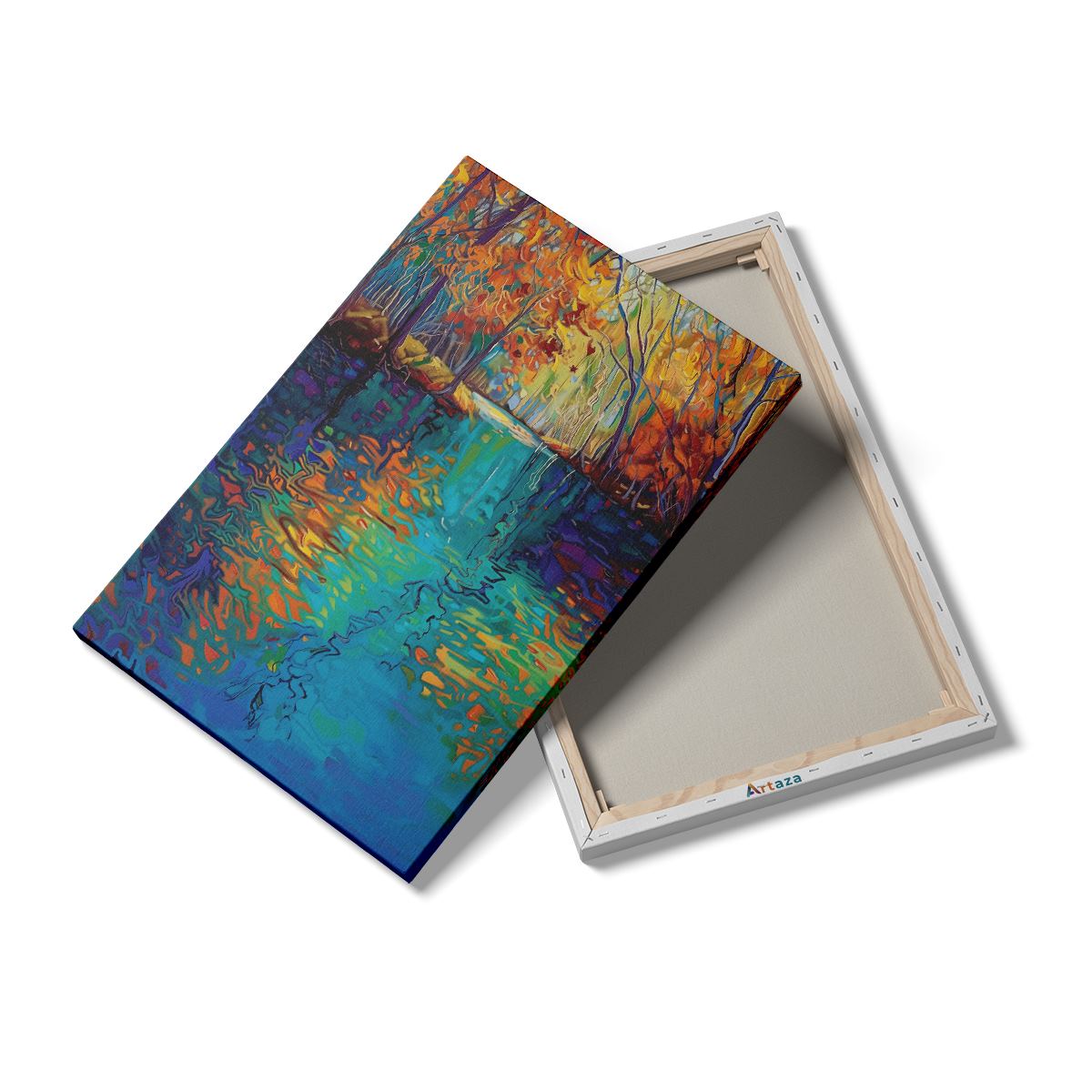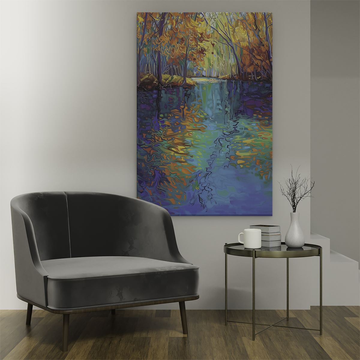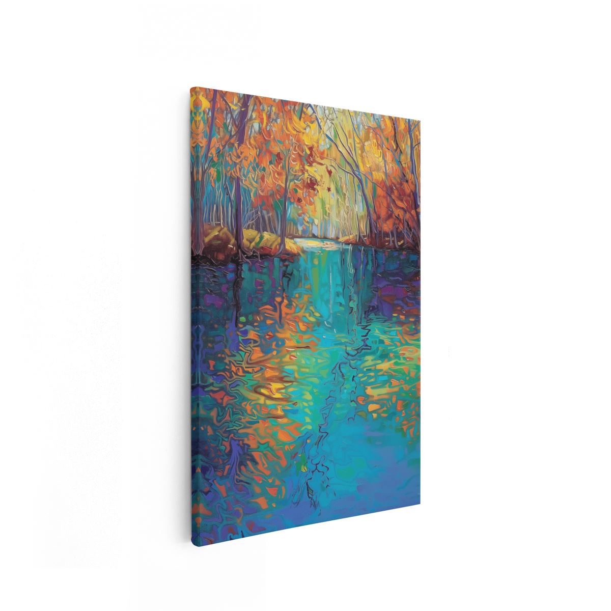 Schilderij Kunstwerk van een Rivier met Bomen op de Achtergrond