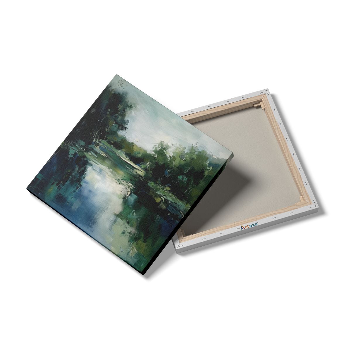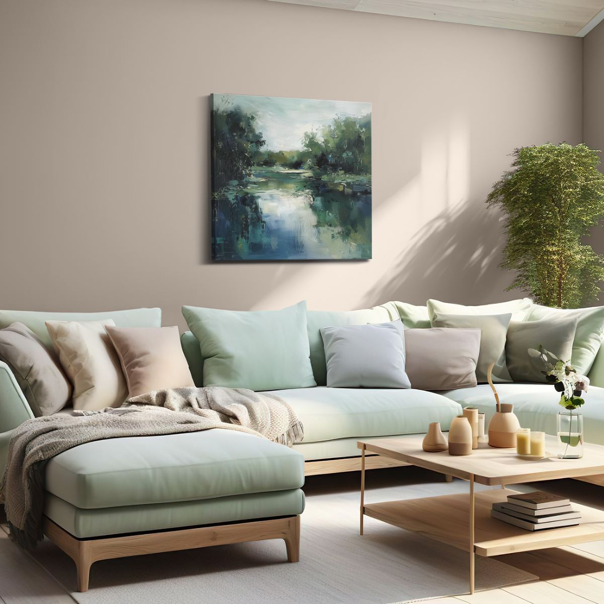 Schilderij Kunstwerk van een Rivier Omgeven door Bomen