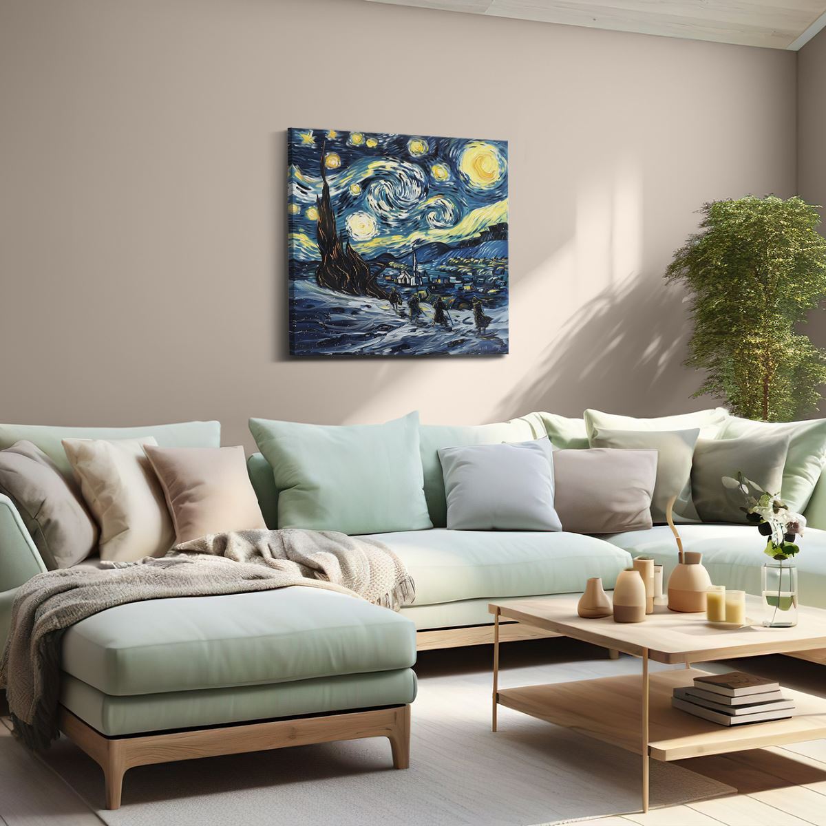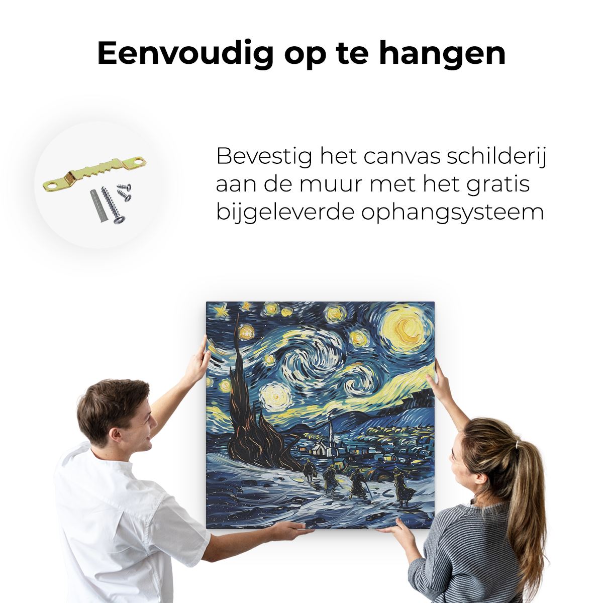 Bij aankoop ontvang je een meegeleverd ophangsysteem, zodat je op een simpele en snelle wijze het schilderij boven de bank of bed kan monteren.
