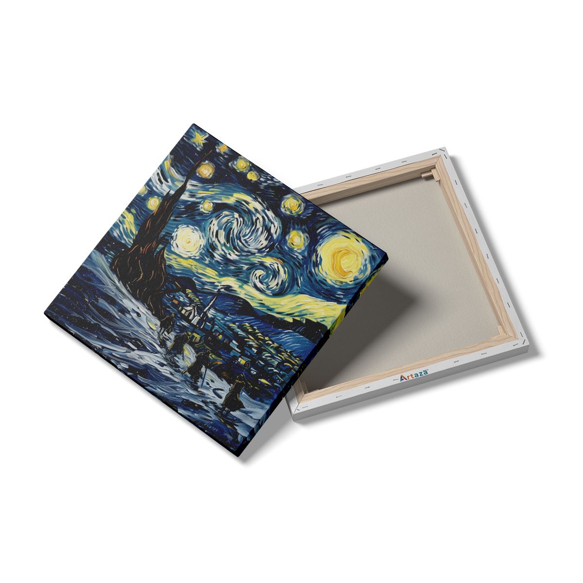 Schilderij Kunstwerk van een Sterrennacht met Mensen op Ski's