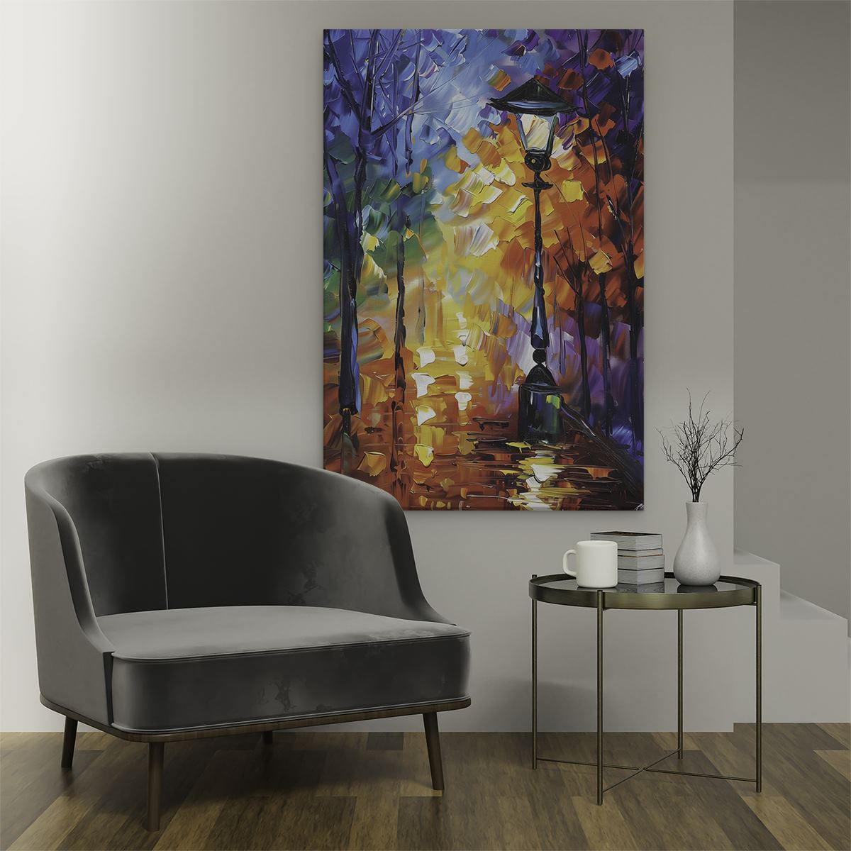 Schilderij Kunstwerk van een Straatlantaarn in de Regen