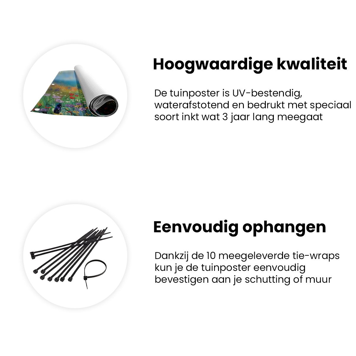 Bij aankoop ontvang je een meegeleverd ophangsysteem, zodat je op een simpele en snelle wijze de tuinposter kan ophangen.