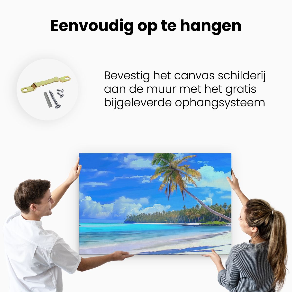 Bij aankoop ontvang je een meegeleverd ophangsysteem, zodat je op een simpele en snelle wijze het schilderij boven de bank of bed kan monteren.