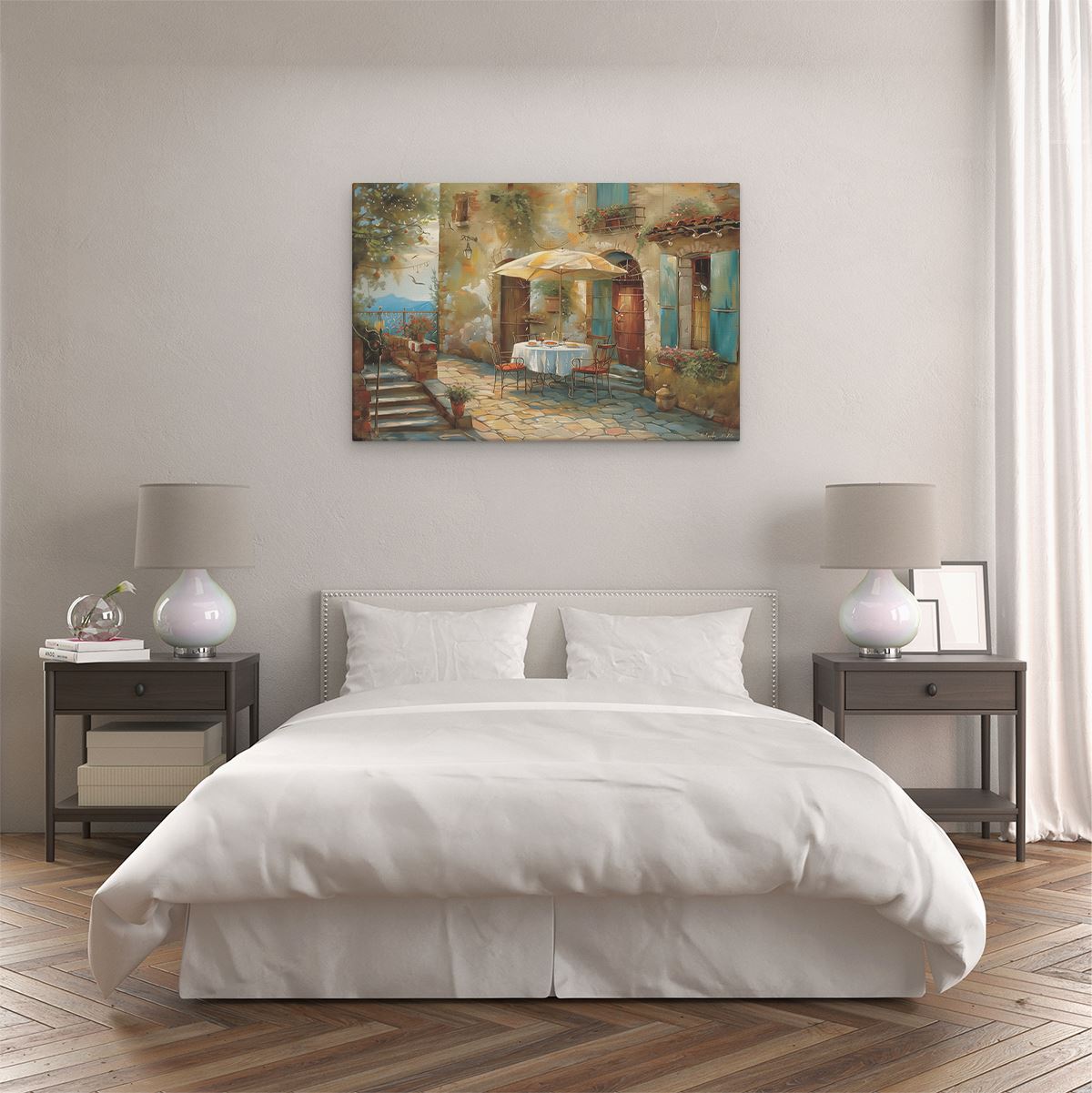 Schilderij Kunstwerk van een Tafel en Stoelen op een Binnenplaats