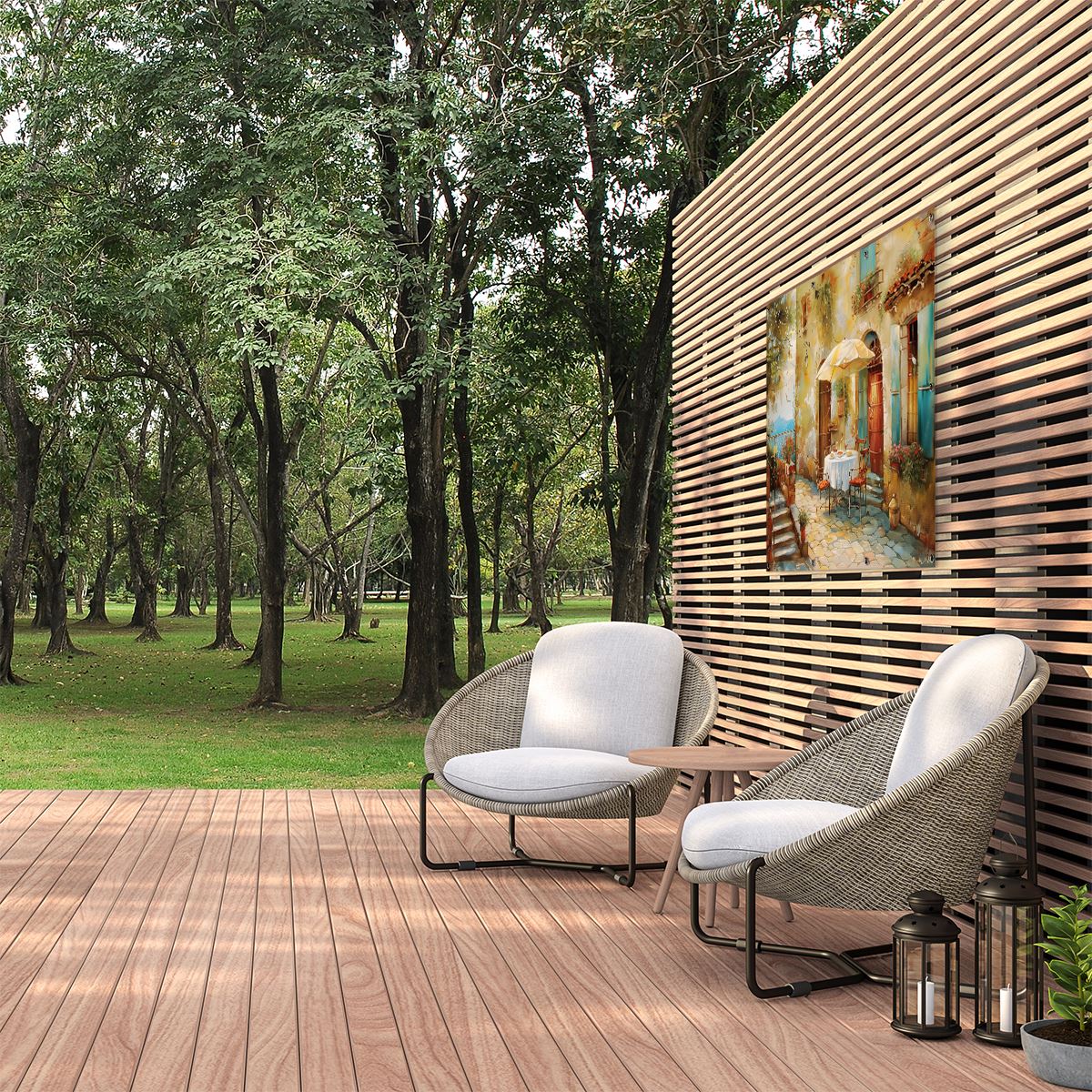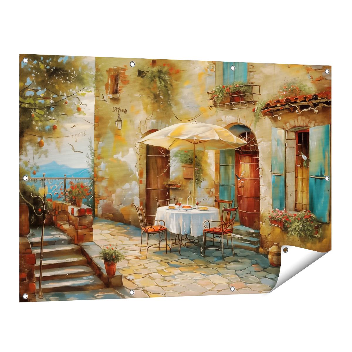 Tuinposter Kunstwerk van een Tafel en Stoelen op een Binnenplaats