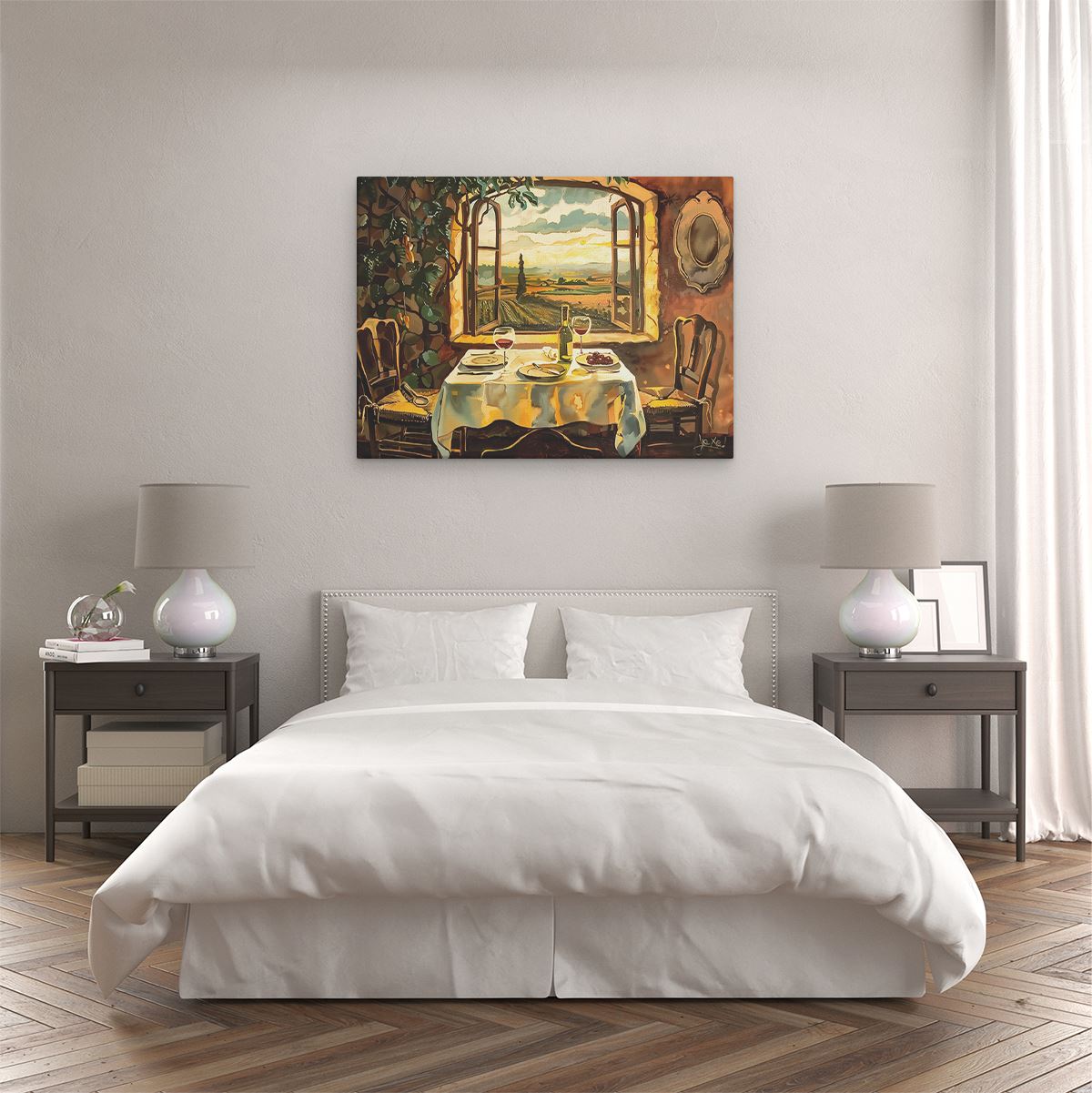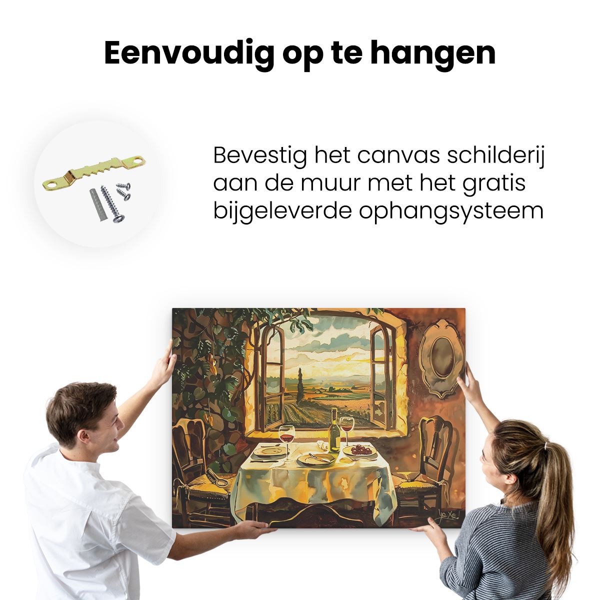 Schilderij Kunstwerk van een Tafel met Wijn en Uitzicht op Toscane