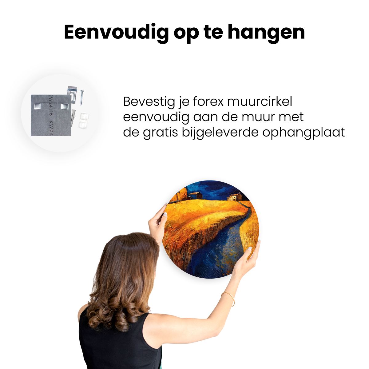 Gebruik het meegeleverde bevestigingsmateriaal om de wandcirkel aan de meeste wanden om te kunnen hangen. Een schroef en plug leveren we mee.