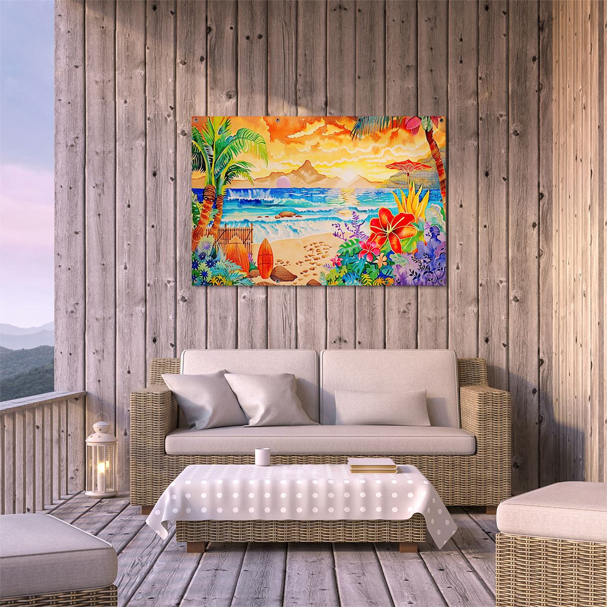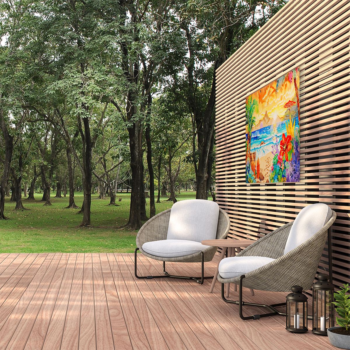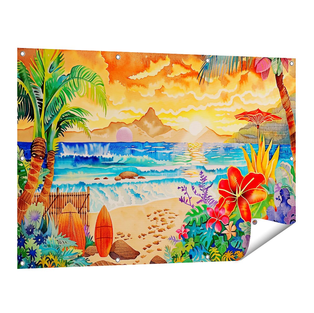 Tuinposter Kunstwerk van een Tropisch Tafereel met Palmbomen en Surfplanken
